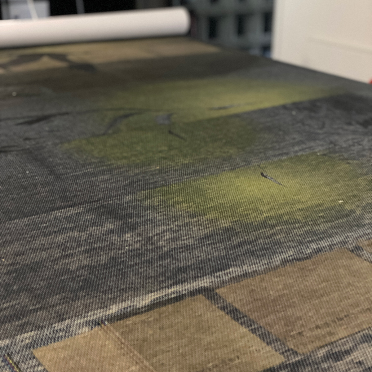 このような感じで20cm単位で様々な印刷方法を試しながら、色を確認していきます。月の「イエロー」を調整している時の写真が下です。最初はかなり強い黄色が出てしまい、落ち込みながらもまたトライが続きます(笑)