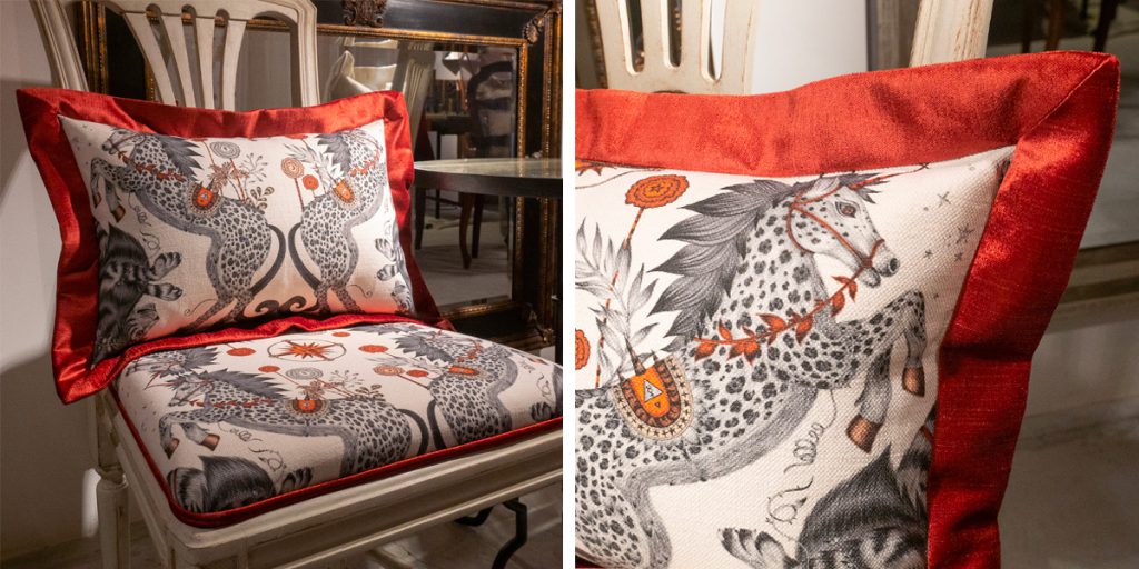 ユニコーンとライオンが交互に現れるデザインなので、クッションにすると柄行きが異なるのも魅力の一つ。