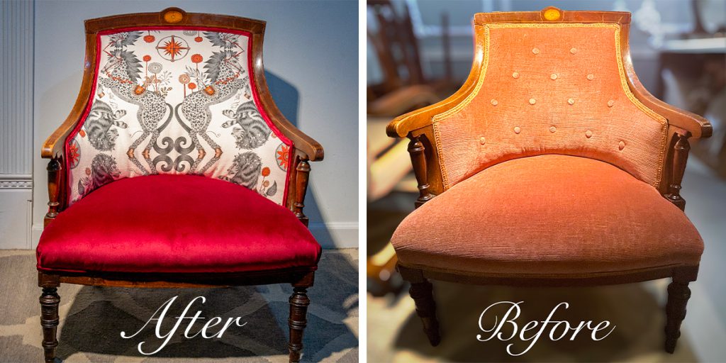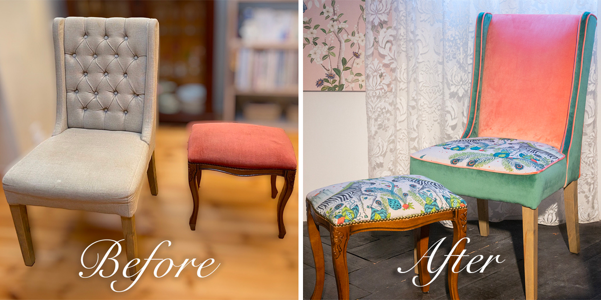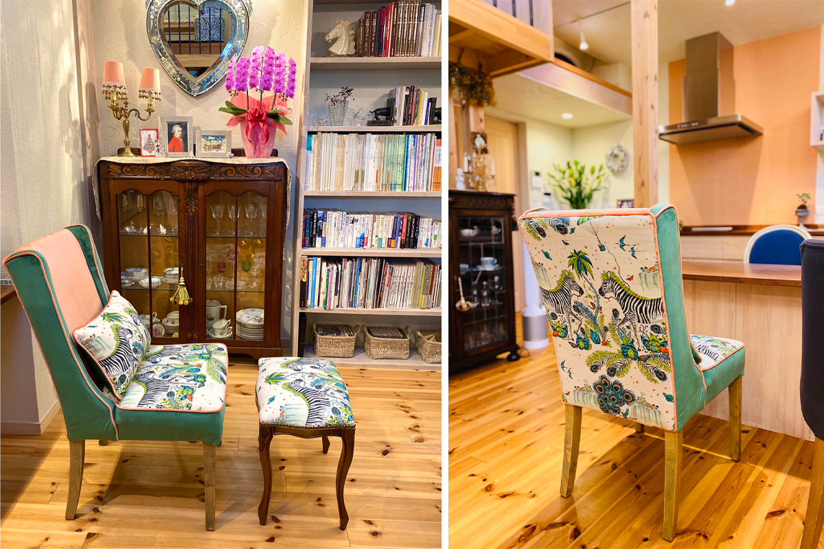 続きまして、椅子の貼り替えのご紹介。こちらのお客様はアンティークチェアを購入され、生地を変えて楽しみたいとの事でご来店頂きました。インスタでも大人気な椅子貼り施工例です!