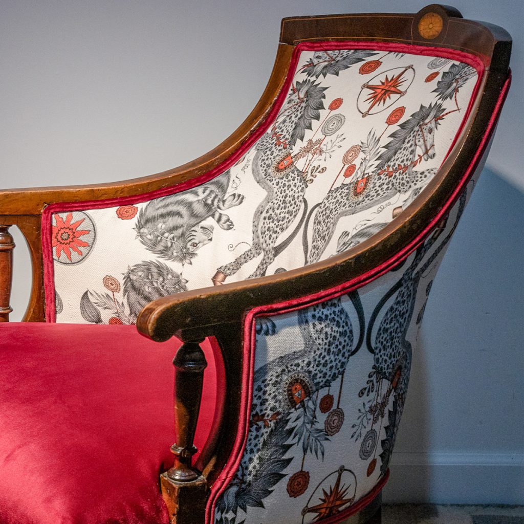 背面もCASPIANで貼り替えました。合わせ生地は赤のベルベット。淵にはダブルパイピングを施して締めています。