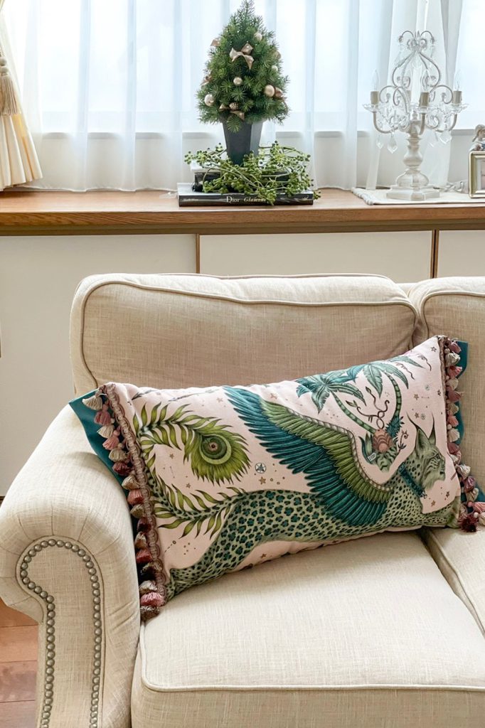 「インテリアの理想はあるけど、保守的なので柄物にはトライできない…」と仰っていたH様。数年前にリフォーム済の真っ白で揃えたシンプルなインテリアに新たに迎えたのは一目惚れしたこのクッション。ベルベット生地、サイドにはフリンジをあしらった枕サイズの比較的大きなクッション。