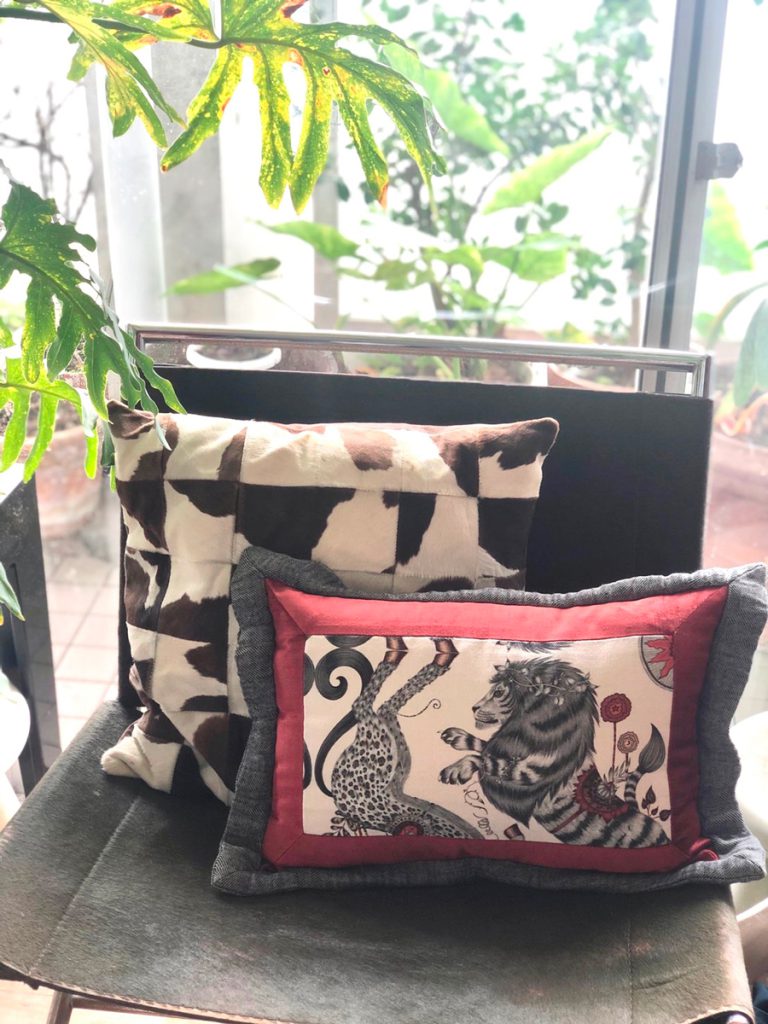 こちらの生地は弊社にてクッションや椅子貼りを制作したところ、大変人気でした。
