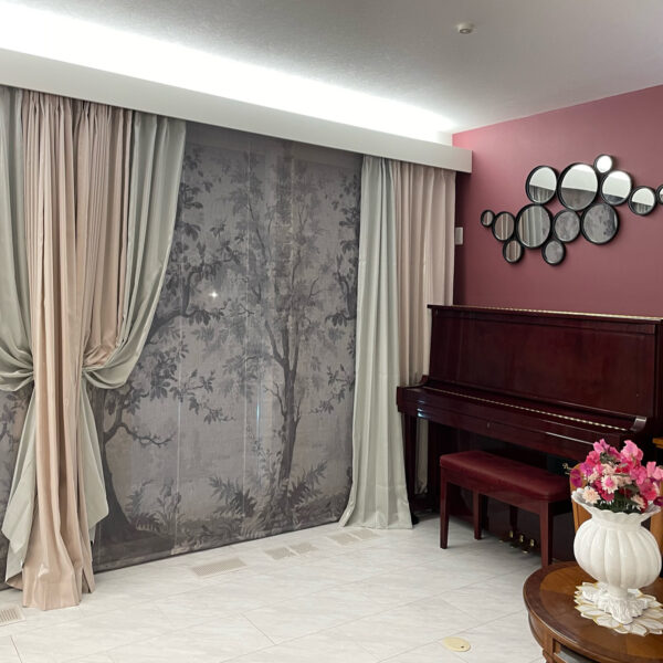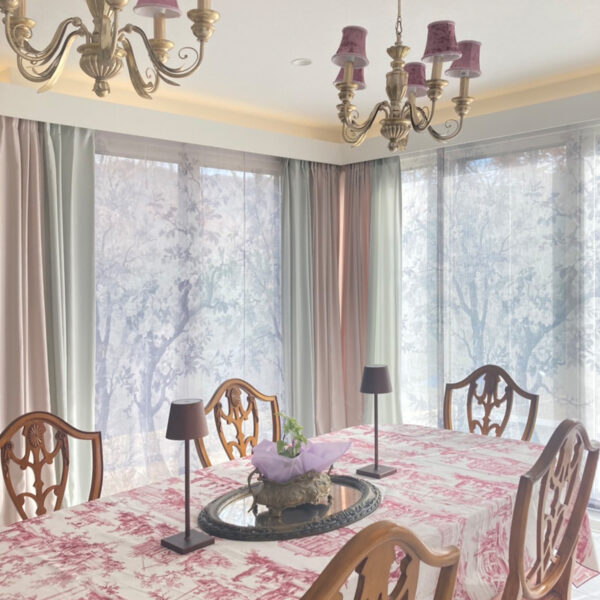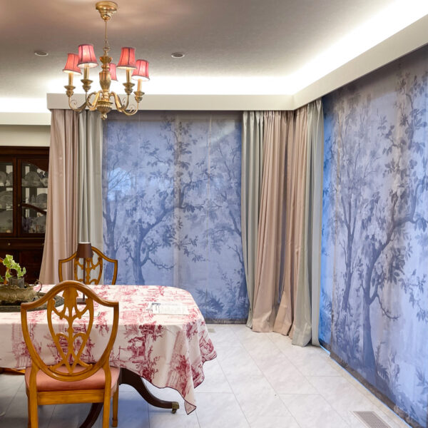 コンセプトをはっきりお持ちのクライアント様で、弊社の施工例を見られていて、ウインドウトリートメントはこれを使いたいということを既に決められていました。リビングに面する窓は広くとってあり、そこからは森の景色が見えて本当にヨーロッパの郊外に来たような趣でした。この景色を生かしてローマンシェードは麻タッチのレースに弊社のデザインで印刷しました。このモチーフはヨーロッパの100年以上前の壁紙から取った森の風景をかなりの加工を入れて色の彩度と濃淡だけで見せたプリントです。施工の後下記のような大変嬉しいお言葉をいただきました。”カーテンはお昼間は後ろの木々の影や木洩れ陽とゆらゆら重なってとても美しいです。また夕暮れ時のマジックアワーの時にはリンゴの木のデザインがブルーに変化してとても幻想的です。” この木のは本当にリンゴの木で実際の壁紙は深いローズ色の実がなっているのです。