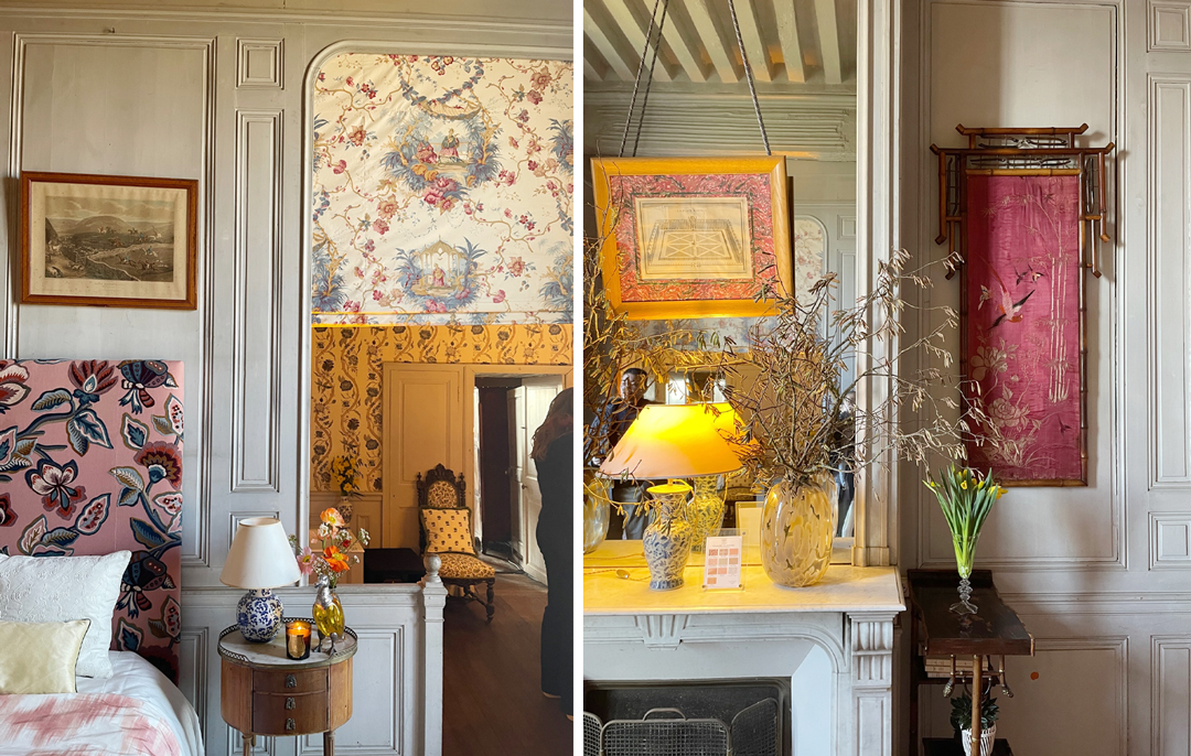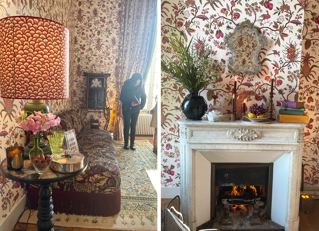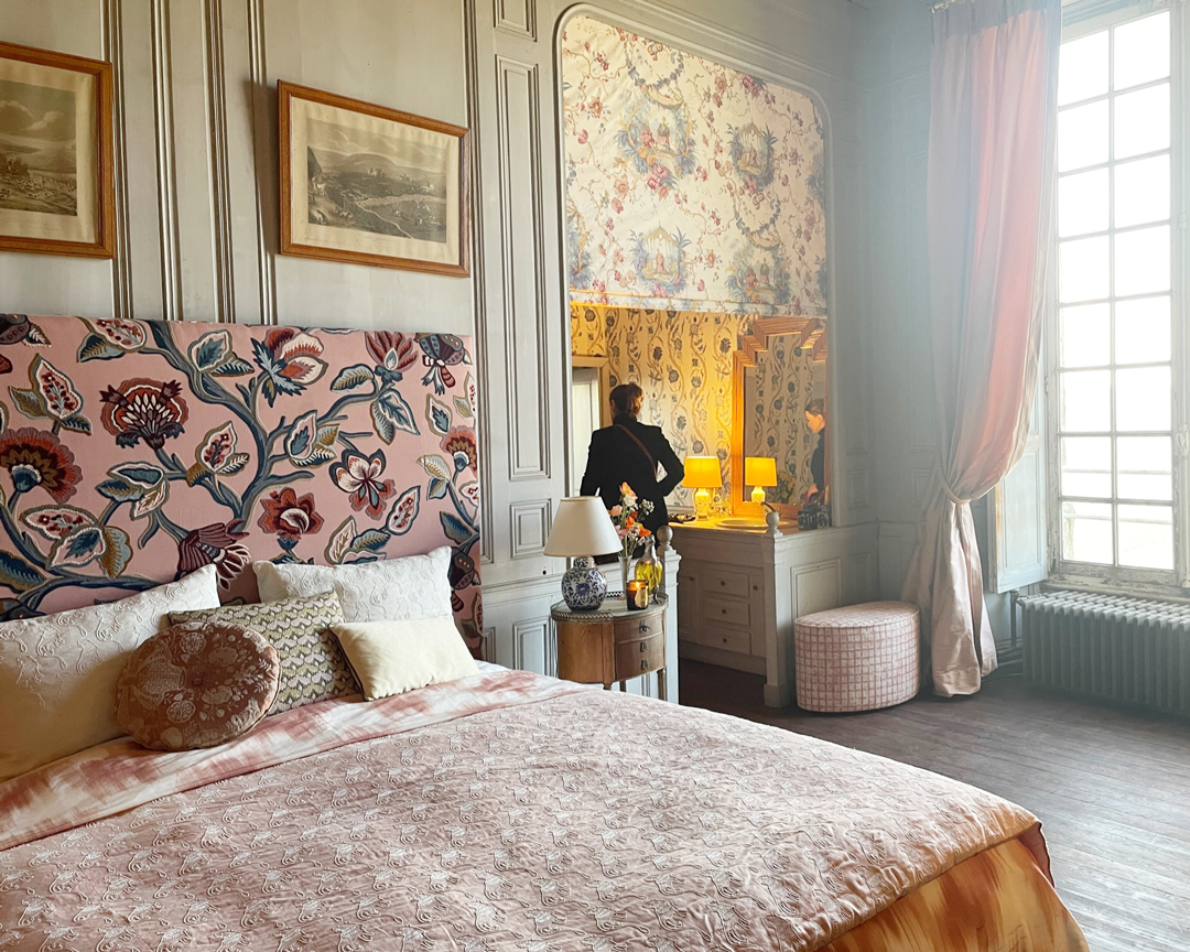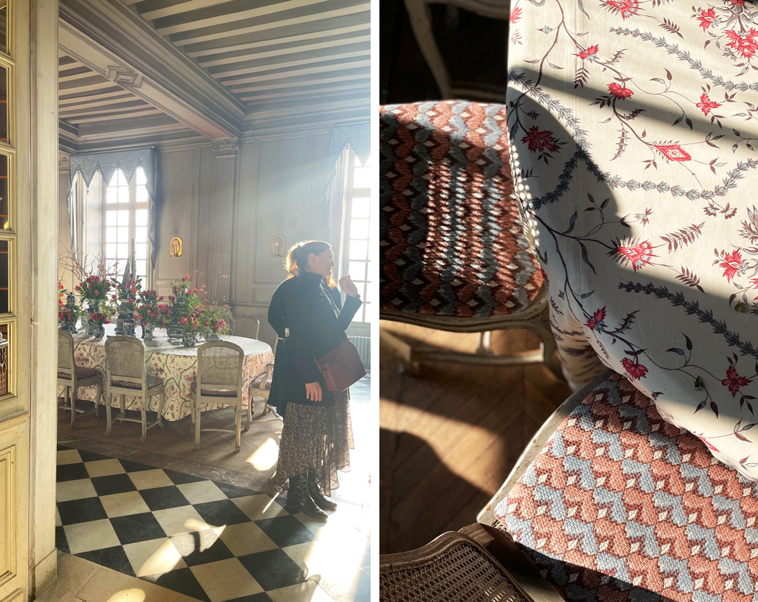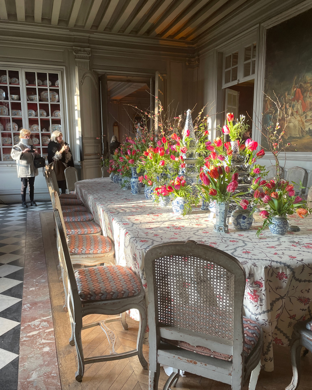 ここはダイニングルーム。ファブリックが美しいことは言うまでもありませんが、テーブルの上に飾られたフラワーが見事でした。また、丘の上に建つこの邸宅の窓からの景色が壮大で、差し込んでくる太陽の光が本当に気持ちのいい空間でした。まるで映画のセットの中にいるような感覚で、歴史や文化を大切にするフランス人のスピリットや価値観を経験する貴重な機会でした。