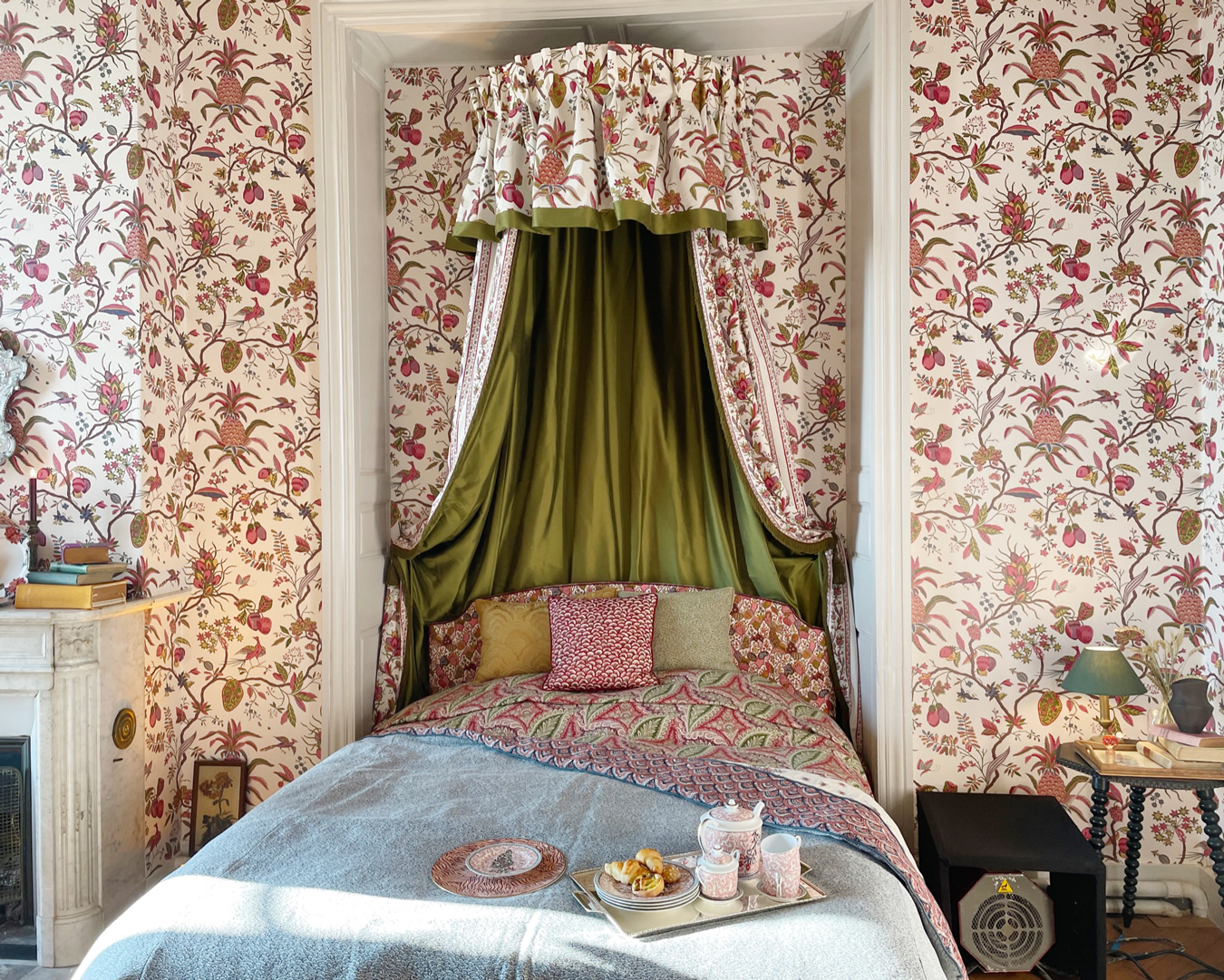 南国の象徴であるパイナップル。そこから広がる枝や実が広がるトロピカルパターン。このデザインは1777年にベルサイユ宮殿の王妃のプライベートルームに実際に使われていたそうです。ベッドリネンも素晴らしいですね。