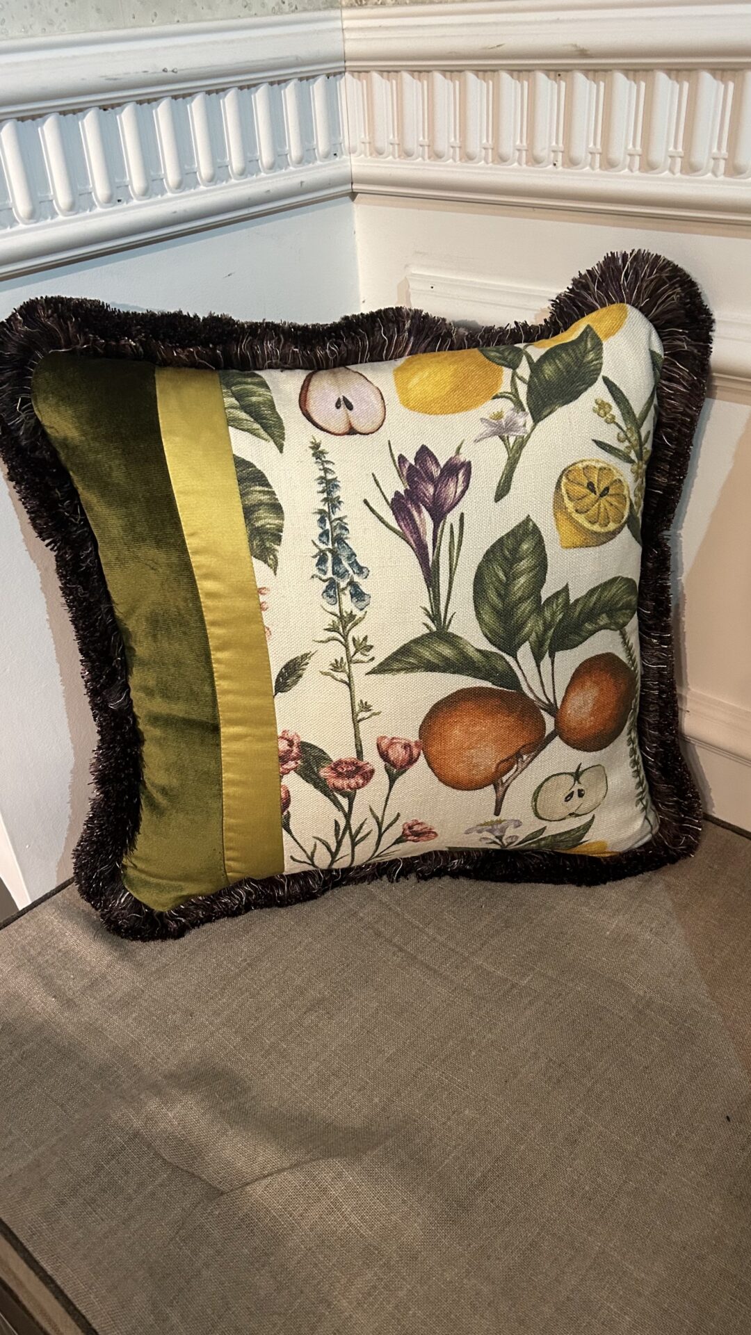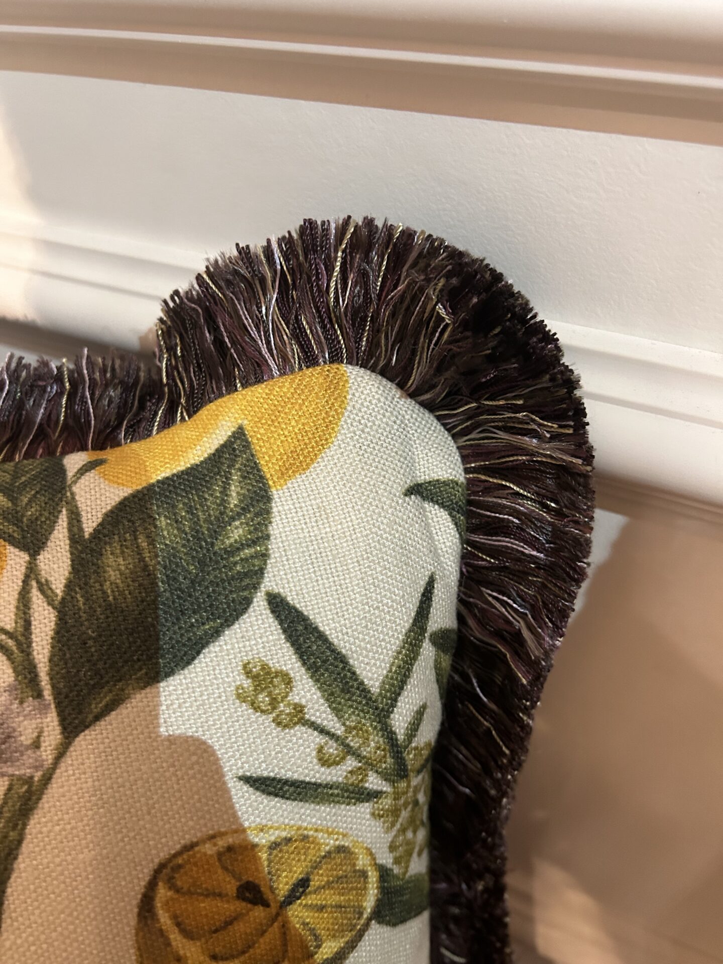 クッションに使われているフリンジや、緑、黄の生地はフルーツ柄にある色とリンクさせている所が1番のポイントです!