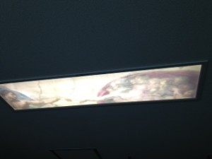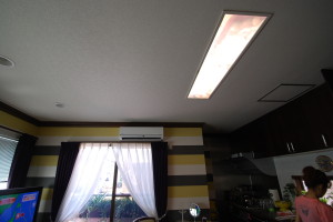 リビングの改装をさせて頂いた物件ですが、照明が埋め込み式の無機質な物でしたので、これを何かデザインをしようと思ったところ、ビニールシートにデジタルプリントをした物を照明の裏側に設置しました。 このビニールシートは粘着式になっていて剥がして貼ることもできますが、あえて裏側に置くことによって灯りをつけない時には、画がはっきりと見えず主張しませんが灯りをつけることによって何ともいえず画が浮き出てくる様な感じになります。