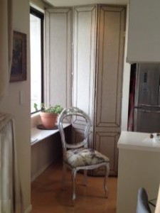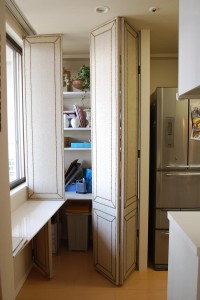 や―っと取り付け完了致しました。リフォーム前には、ここに棚を作ってカーテンで隠すつもりでしたが窓際のカウンターが埋め込み式になっていて取り外しが出来なかった為急遽デザインを変更!![レッスンでパーティションを作っているのでこれを収納用の折れ戸に出来ないか!]と また新たな試みをさせて頂きました。