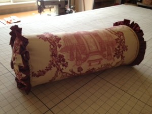 この、筒型のクッションってなかなか気に入った物が手に入り難いので手作りにはとてもお勧めです。意外と簡単ですし大きさもご希望のサイズに出来ますし、色々アレンジも可能です。 生徒さんは、このガーデンのトワル生地を気に入られフリルにコードも挟んで製作されました。皆さん選択されるものがとてもレベルが高く、素敵でセンスも良い方でした