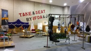 22脚の椅子をIFDAとJIDのデザイナー達がアップサイクリングをし展示をしました。 リサブレアから ミケランジェロの絵をデジタルプリントし背面に張り、座面はラグを張り込み、淵には金拍を貼ました(左) と、パッチワークにブラッシュフリンジを挟み込んだ一人掛けのソファーを展示しました。 みなさんどれも、手の込んだ作品でお客様も楽しくご覧になられていました。