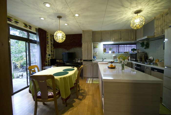 キッチンの扉もカウンターの色に合わせて塗装。照明もビンテージ感覚のものを。 シニア世代の方のお宅ですが、お家を楽しんで頂いている様子でとてもうれしいです。
