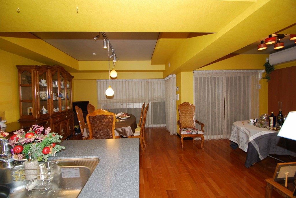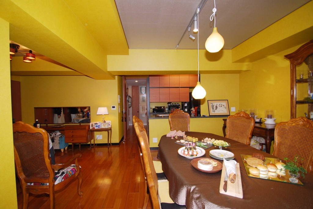 カサマンスのクロス、写真では質感はわかりませんが表面に凹凸があって落ち着いた雰囲気になっています。イエローは何にでも会うので微妙な色の選び方を間違えなければベースとしては最適なカラーです。さすがインテリアもクラシックな家具や50’sの家具やいろいろなスタイルをうまくアレンジされています。天井はシルバーを選んで周りに黒にシルバーの小さなモールディングをいれました。ここがポイントです。この細部の良さをわかっていただけるのはうれしいです。巾木もわざわざはずして黒のものを取り付けました。そのほかのしろが出ているところもすべてダイノックシートの黒をはりました。価格は上がりますがこの細部の仕上げはとても大事です。照明も明るさを調整したり、いろいろな照明がつけれるように配線ダクトにしましたが、ここでは電気屋さんのいいアイデアで2本付けてスイッチをそれぞれにつけるようにしました。照明のいろんなシーンが楽しめるというのはインテリアの効果と変化がでます。