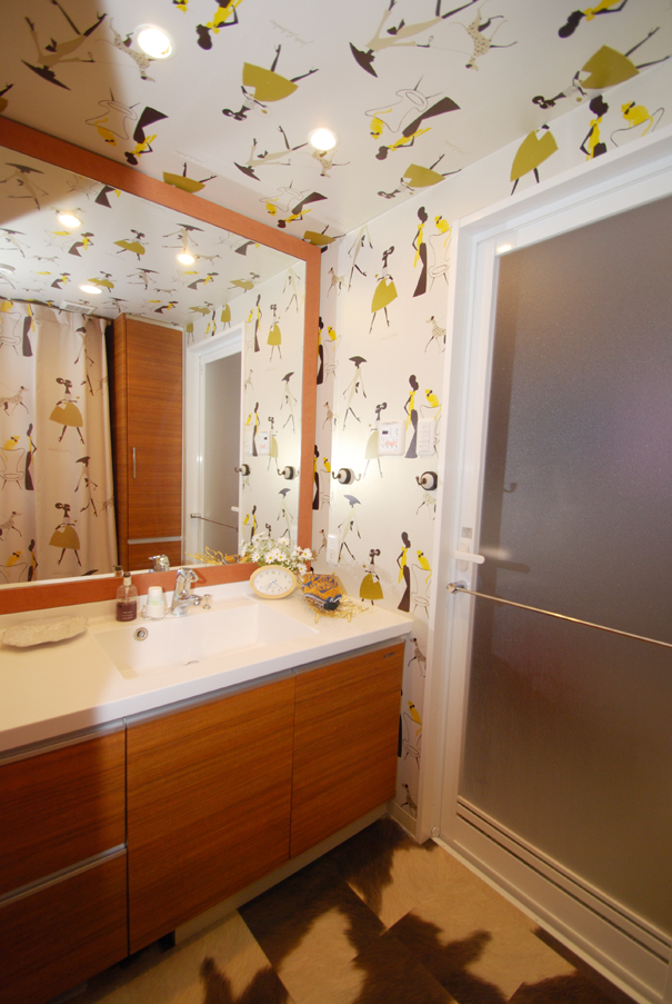 以前からこの壁紙を使いたいと考えられていたキッシュな壁紙です。張り方がポイント天井に持ってくるというご希望でこの大胆さがいきてます。