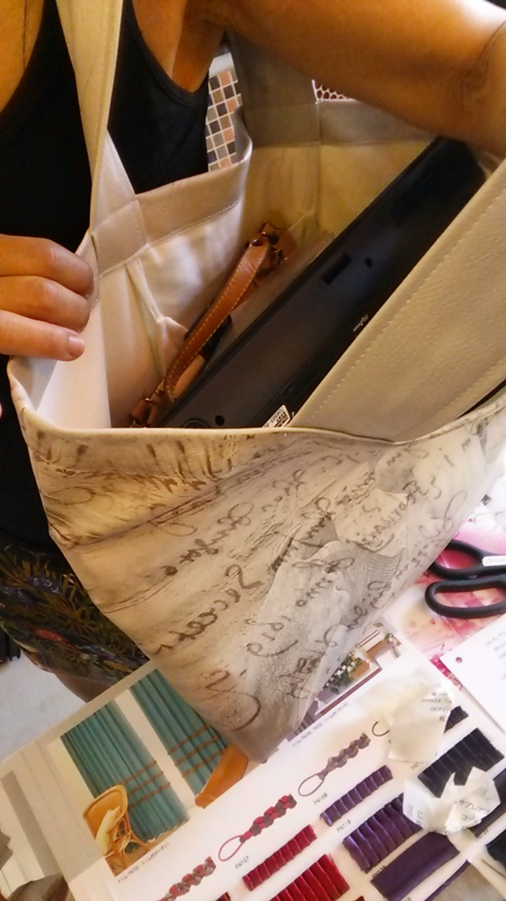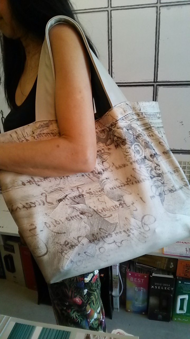 リサブレアのHPプリンターでトートバッグをつくっていますが、前に作ったものより横とマチを少し大きくしてパソコンが入るようにしました。しかも持ち手を短いく太く肩の負担がかからないようにしました。若いときは気にならなかったのですが、バックの重さがみにしみるのです。これは人工皮革なので伸びがあるので肩への衝撃も和らげ最高です。しかもデザイン的にもグッドです。 私のコンピュータは重量があるのでいつもカートをひいていましたが、これなら大丈夫。