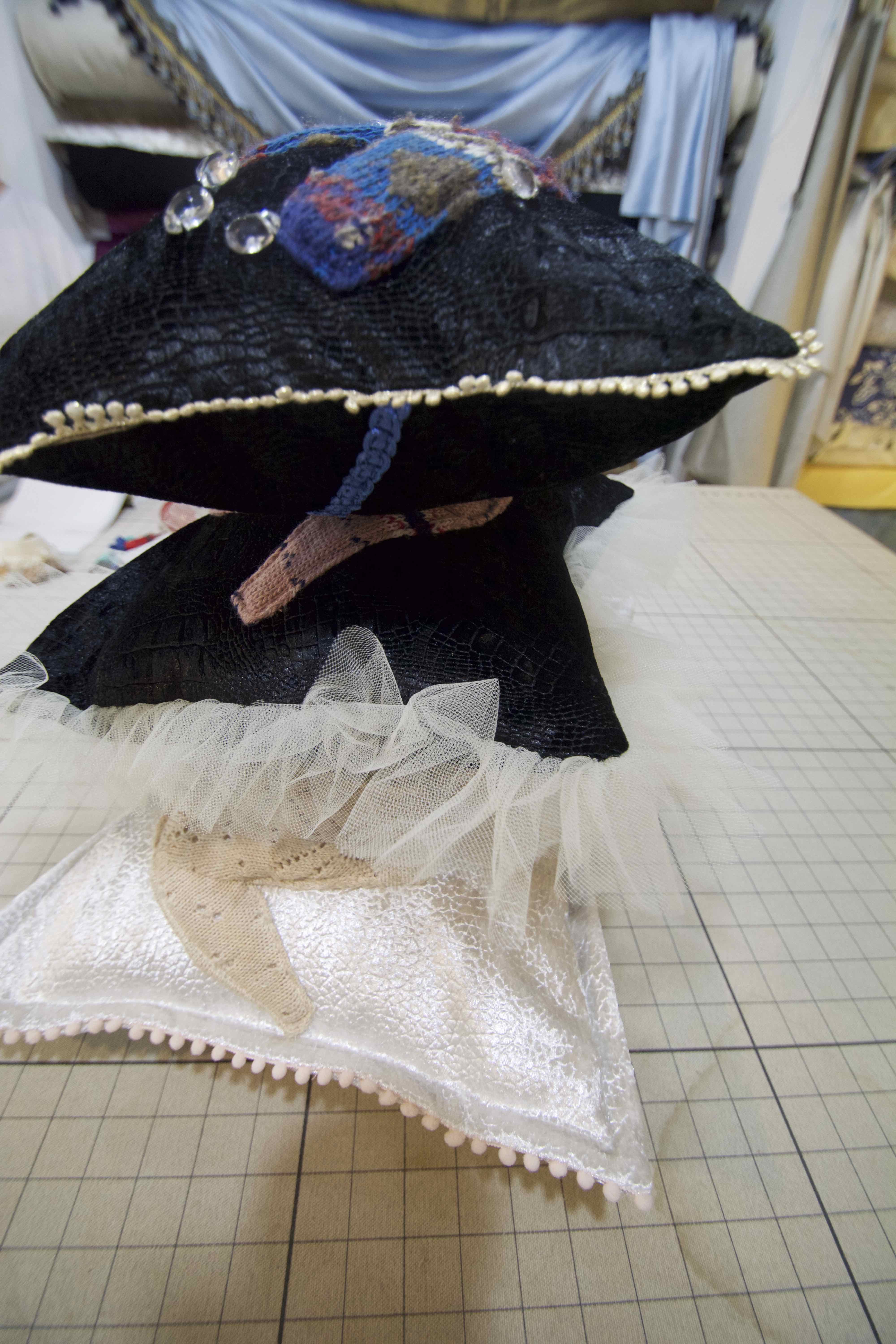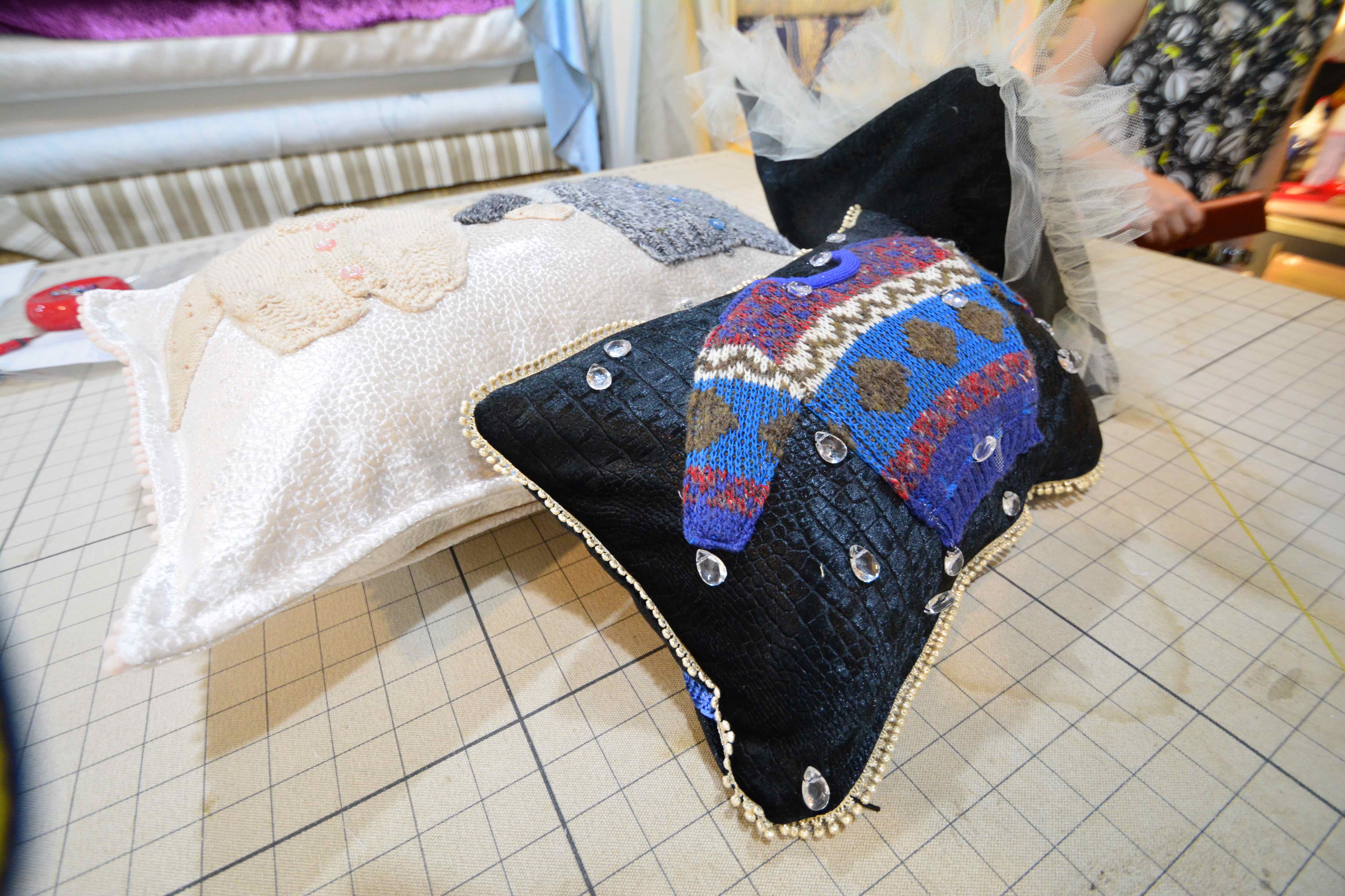 続いて、クッションをご紹介いたします。長年愛用していた。セーターのアップリケが付いた「セーター」をリ・プロデュースしてクッションになりました。とても個性的で可愛いらしいクッションです。使わなくなったアクセサリーパーツや、クリスタルを付たり、木馬のグログランを廻したりと、世界で一つしかないクッションが3つ完成しました!お客さまはこれからもう少しデコラティブな装飾をされるそうです⭐︎
