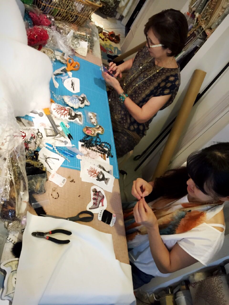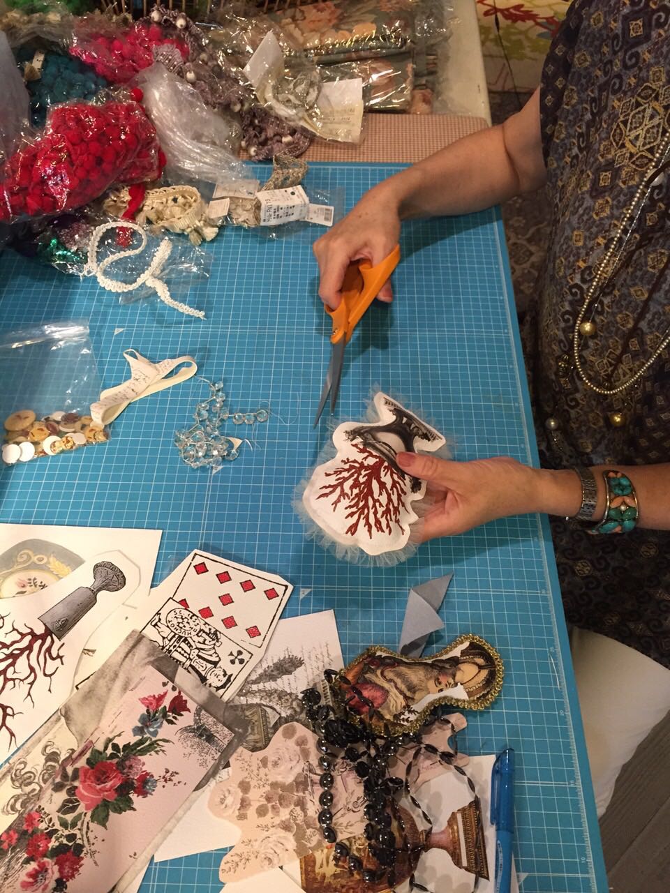 今回は30種類のモチーフを準備しました。素材は合皮に印刷をしています。みなさまお好きなモチーフを選んでいただき、それに付けるパーツを選びます。リサブレアには数多くのパーツがありますので、そこからデザインしていくのはとっても楽しい工程です。参加者の方々は真剣。クリエイティブな作業に没頭していました。