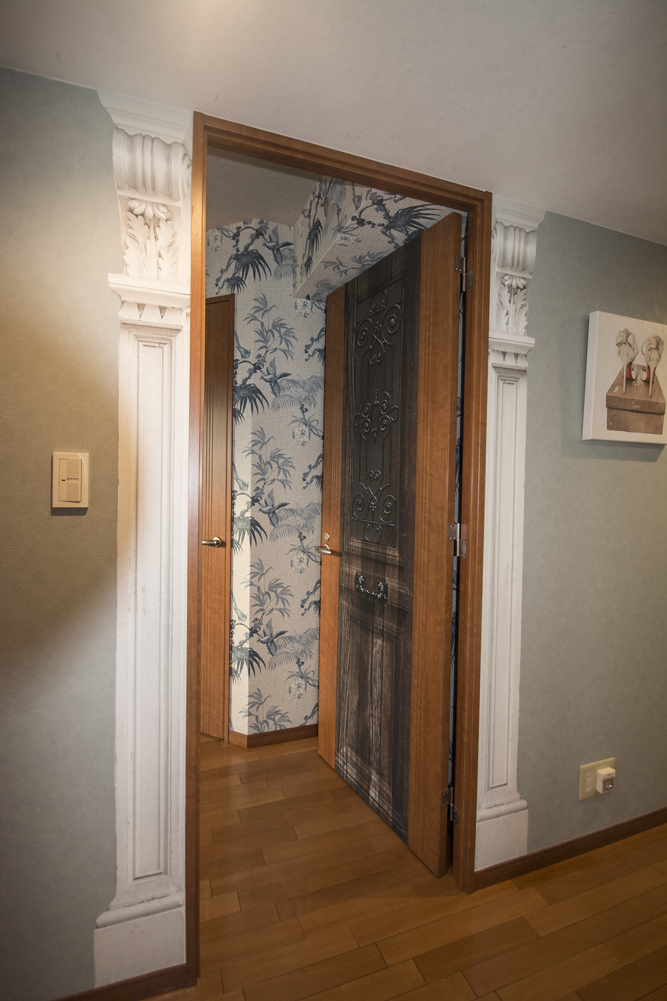 扉を何とかしてほしいということで、壁紙シールをはって、扉両側にも写真のコラムを加工してプリントしました。住宅では初めての試み。リサブレアオリジナルです。