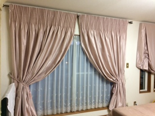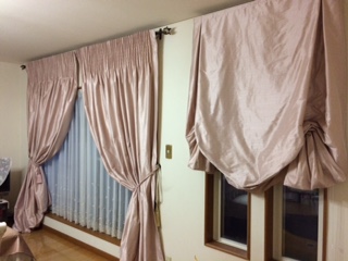 生地はサーモンピンクのシルクでギャザーカーテンを具体的にご希望されました。