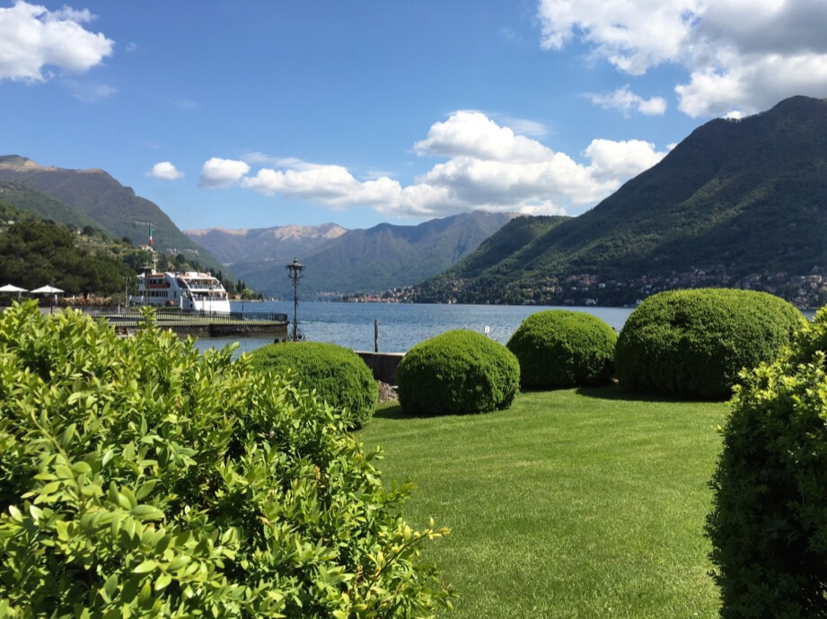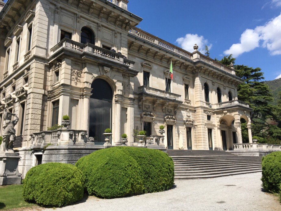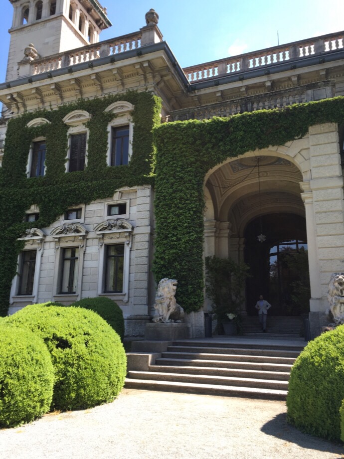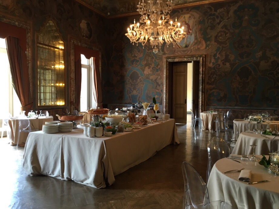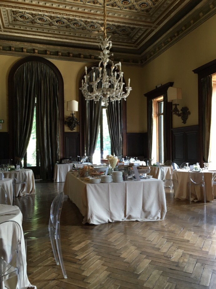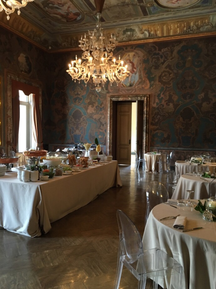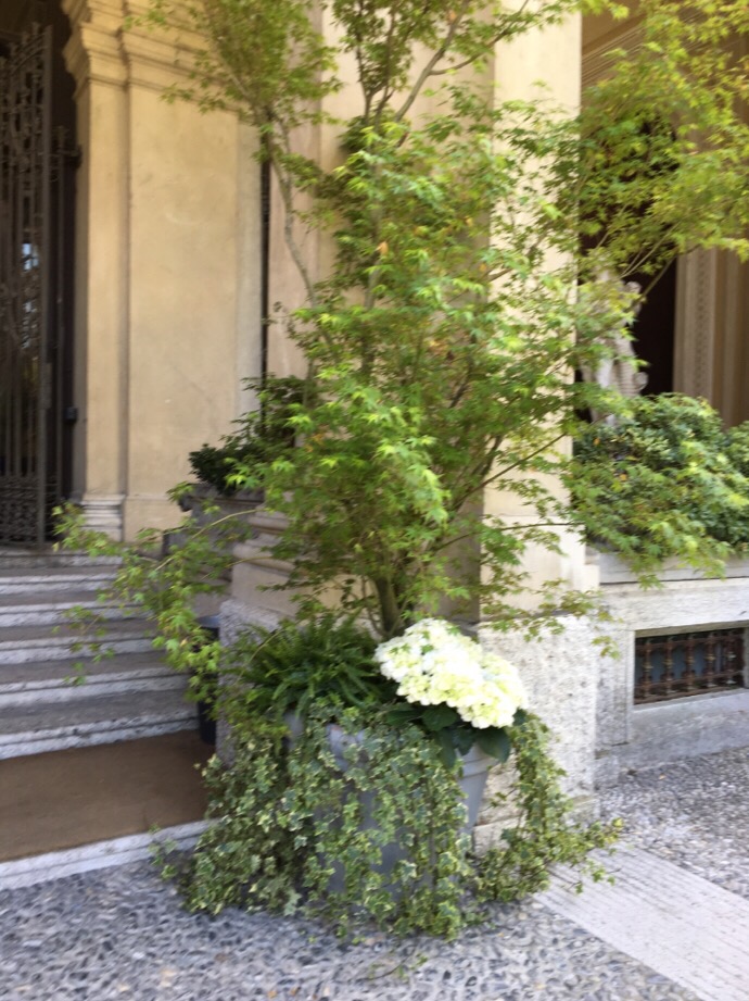 コモ湖はイタリアの避暑地として湖を背景として、自然の美しさその中にある邸宅の美しさは特筆すべきものがあります。空気が澄んでいるからでしょうか。写真が綺麗なのです。展示会が開かれたところのお庭をはさんで18世紀にエルバファミリーの邸宅であったヴィラエルバが有ります。てんじかの間はレストランやプレスルームになっていますが、余りに素晴らしいので写真を撮らせてもらいました。レストランの中の壁は石材にペイントや大理石のインレイです。外の植物の寄せ植えもいい。