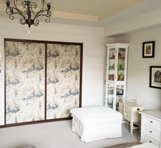 そしてお部屋で気になるところ、襖を見るたびになんとかしたいというご要望。この輸入クロスもベースが年代を経た素材感がでています。クラシック柄といえばダマスクになりますが、この柄はクラシックモチーフが微妙に混ざり合っています。