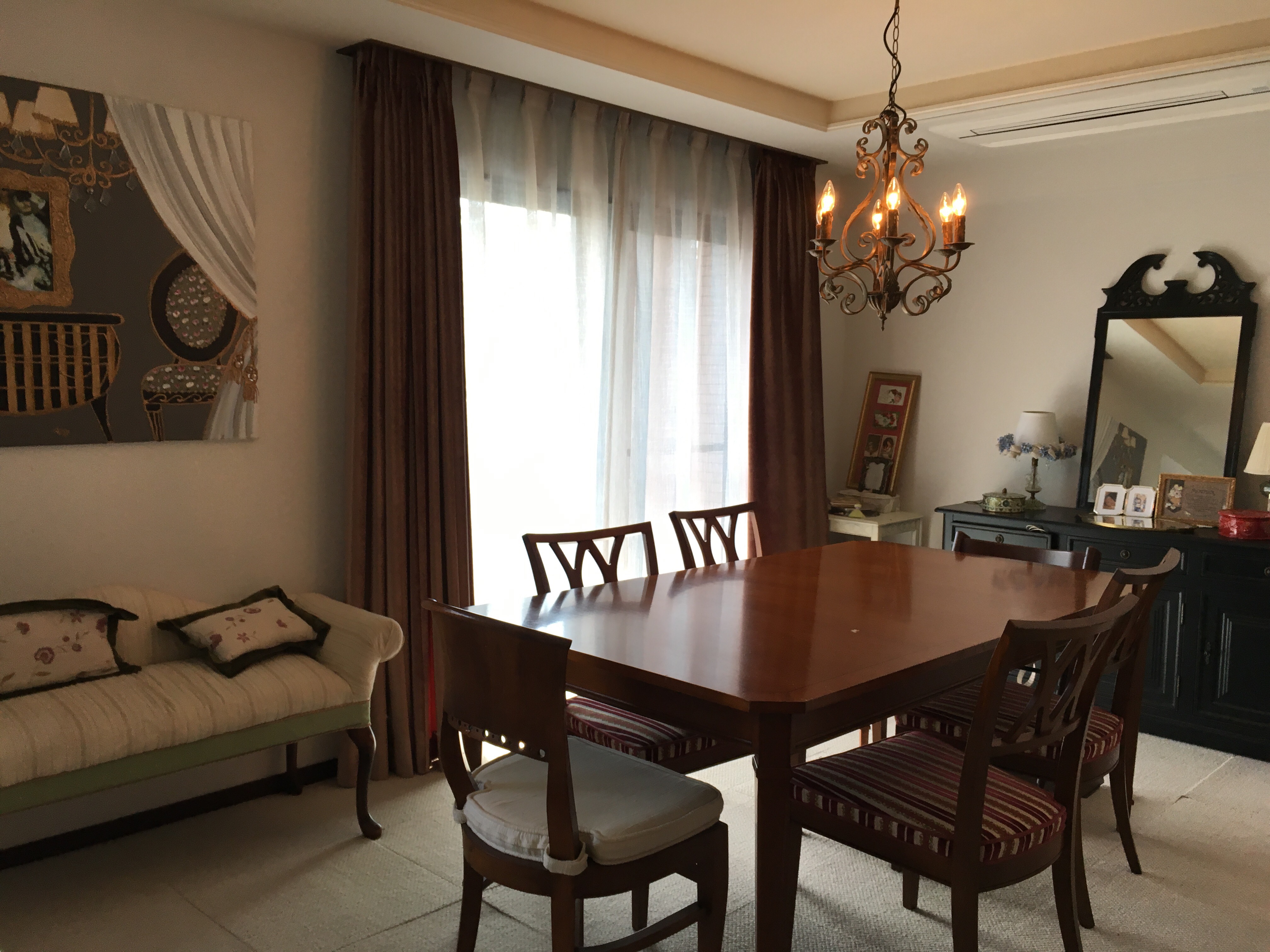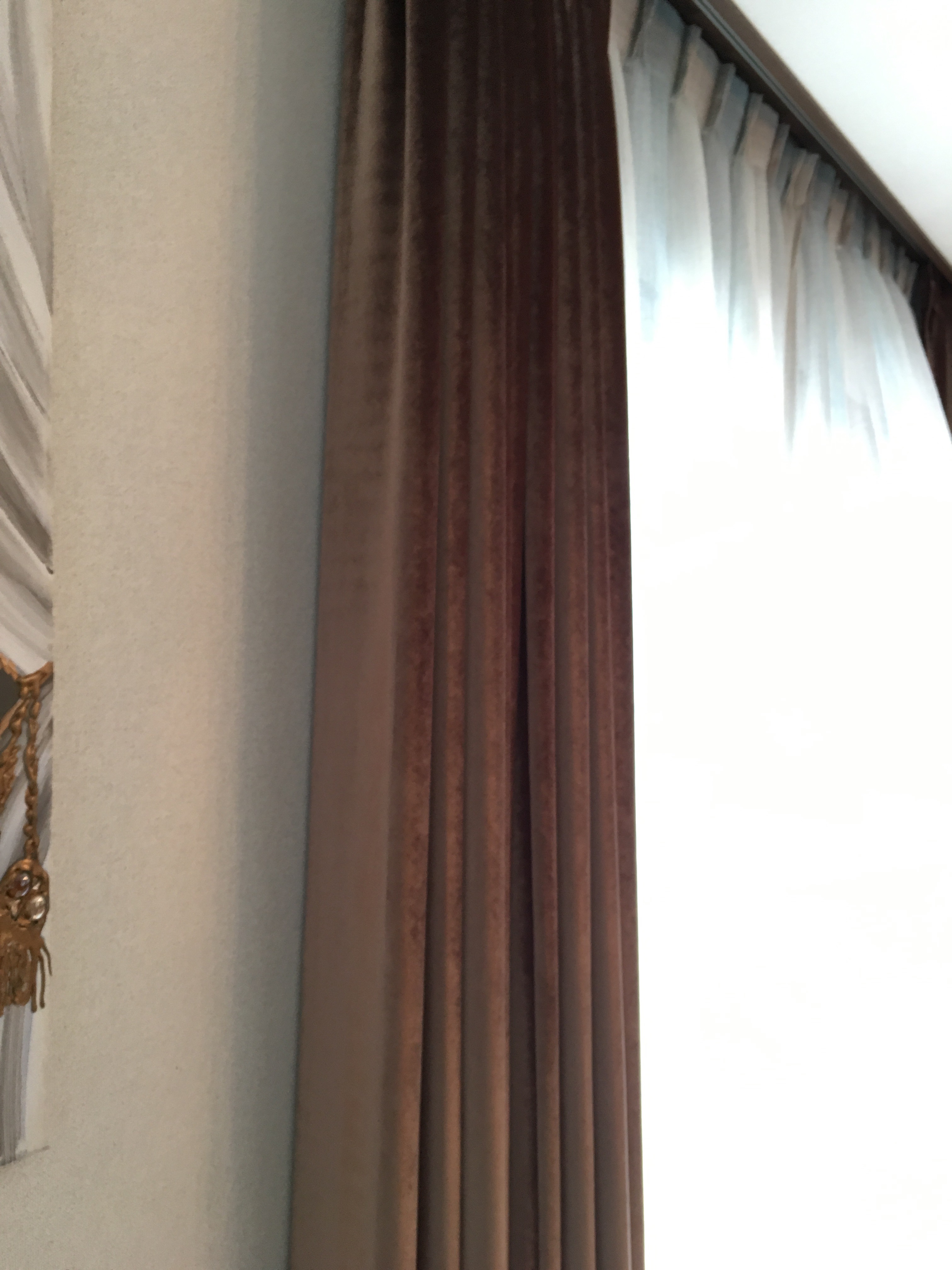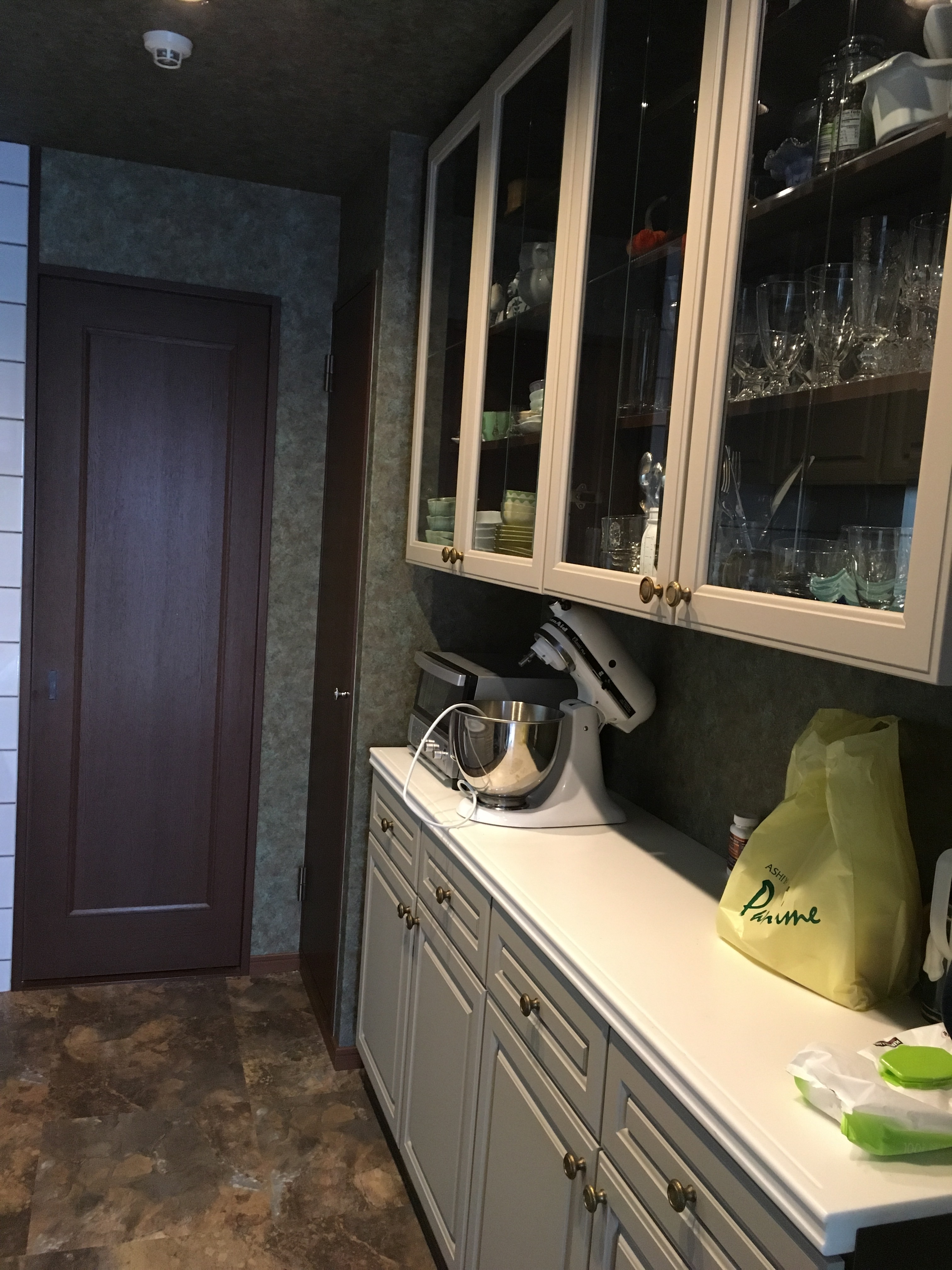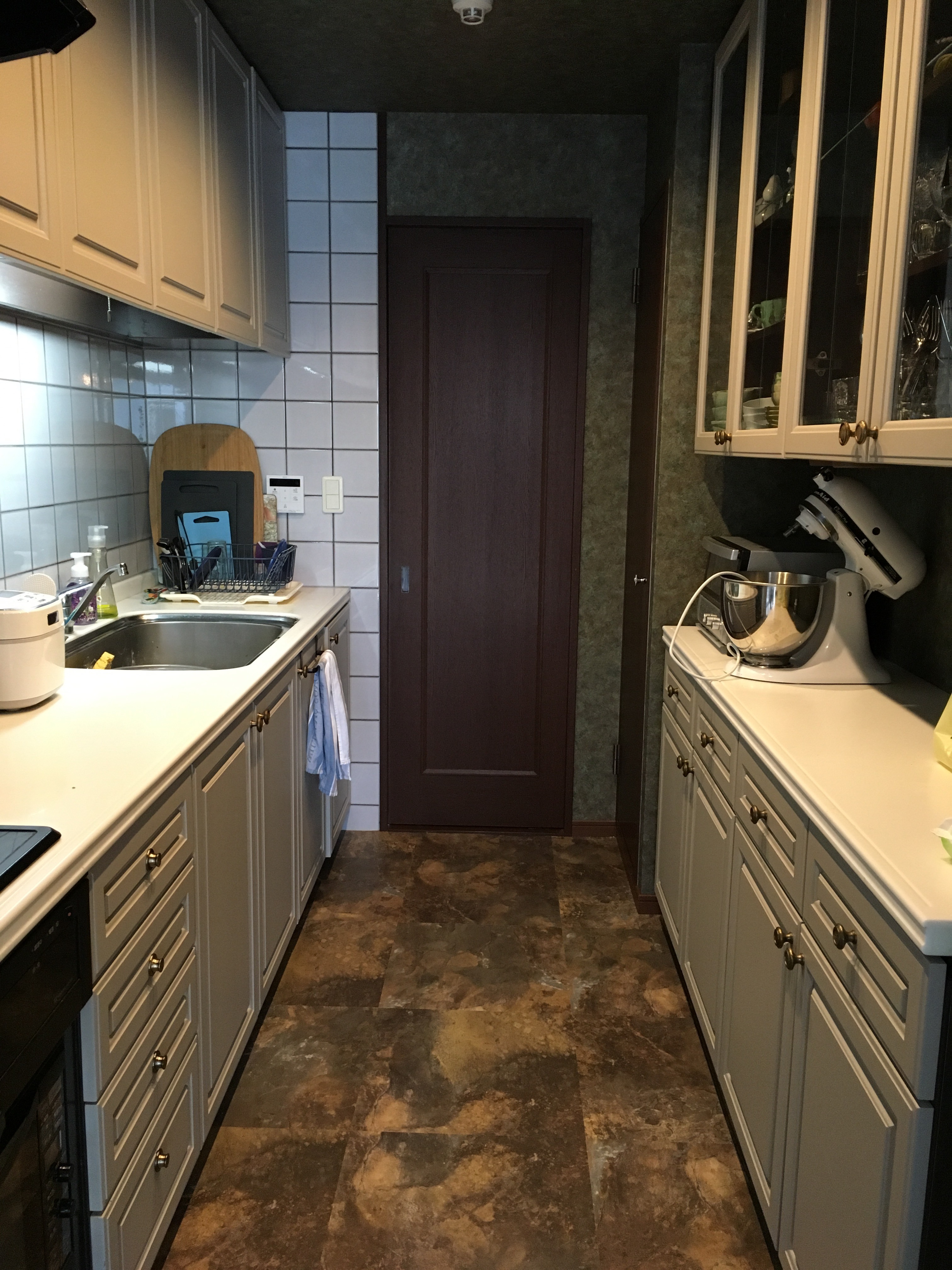 キッチンとリビングカーテン、リビング襖などリリノベーションさせていただきました。キッチンは壁床天井を替えて、扉も色を塗り替えました。お客様が初めに扉はブラックはどうかなとおっしゃったのが、この壁紙と塩ビタイル、アイボリーが少し入ったグレイ色をご提案させて頂いたきっかけです。大概の場合は窓がなく陽が入らなければ明るい色でないとというご要望が多いのですが、ブラックということはちょっとぐらい濃い色をご提案してもいいのではと。更に中の棚の色がダークブラウンなので、ブラウン系でまとめたかったこと。出来上がりはスッカリ変貌。個性的で快適なキッチンになりました。お客様からも引越しした気分とおっしゃっていただきました。カーテンの決め手は別な窓にウッドブラインドがかかっていたこと、それでリサブレア直輸入のベロア風ベルベットとレースはナチュラルテイストのザックリ素材のブルーがグラデーションのレースをご提案。海外の展示会では多く見られるテクスチャ感のあるトロンとしたベルベットがどうして日本にないのでしょう。リサブレアのホットな素材は今ベロア風ベルベットと麻素材です。