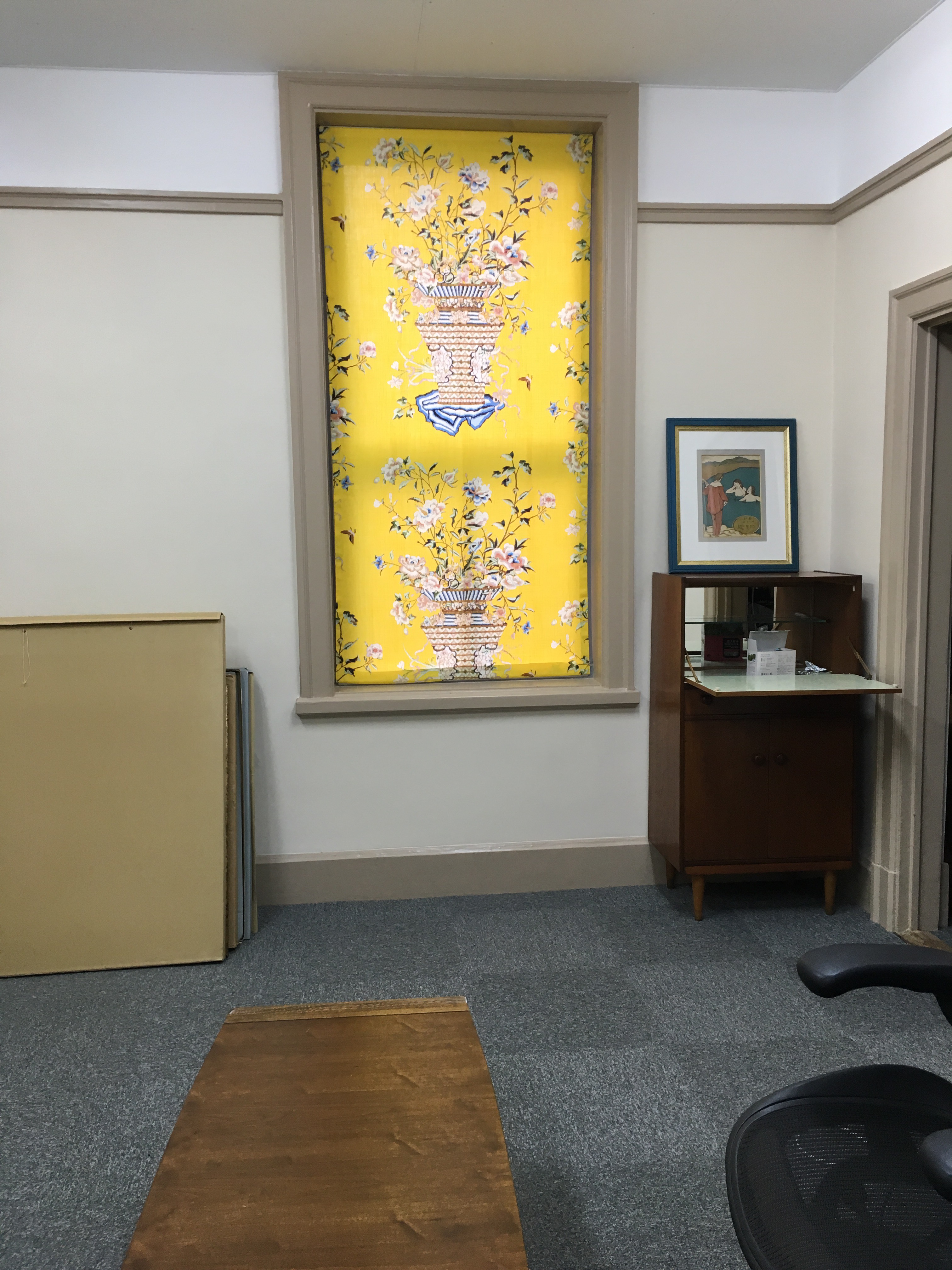 会社の事務所を神戸の歴史建造物であるビルに移され、そこのカーテンを依頼されました。窓を印象的にしたいというご希望で、ちょうどその時ジムトンプソンの新作が出たので、提案させていただきました。このビルは看板といい、中のインテリアといい、昔のままで維持され、トイレもモザイクタイルビル貼りなのです。