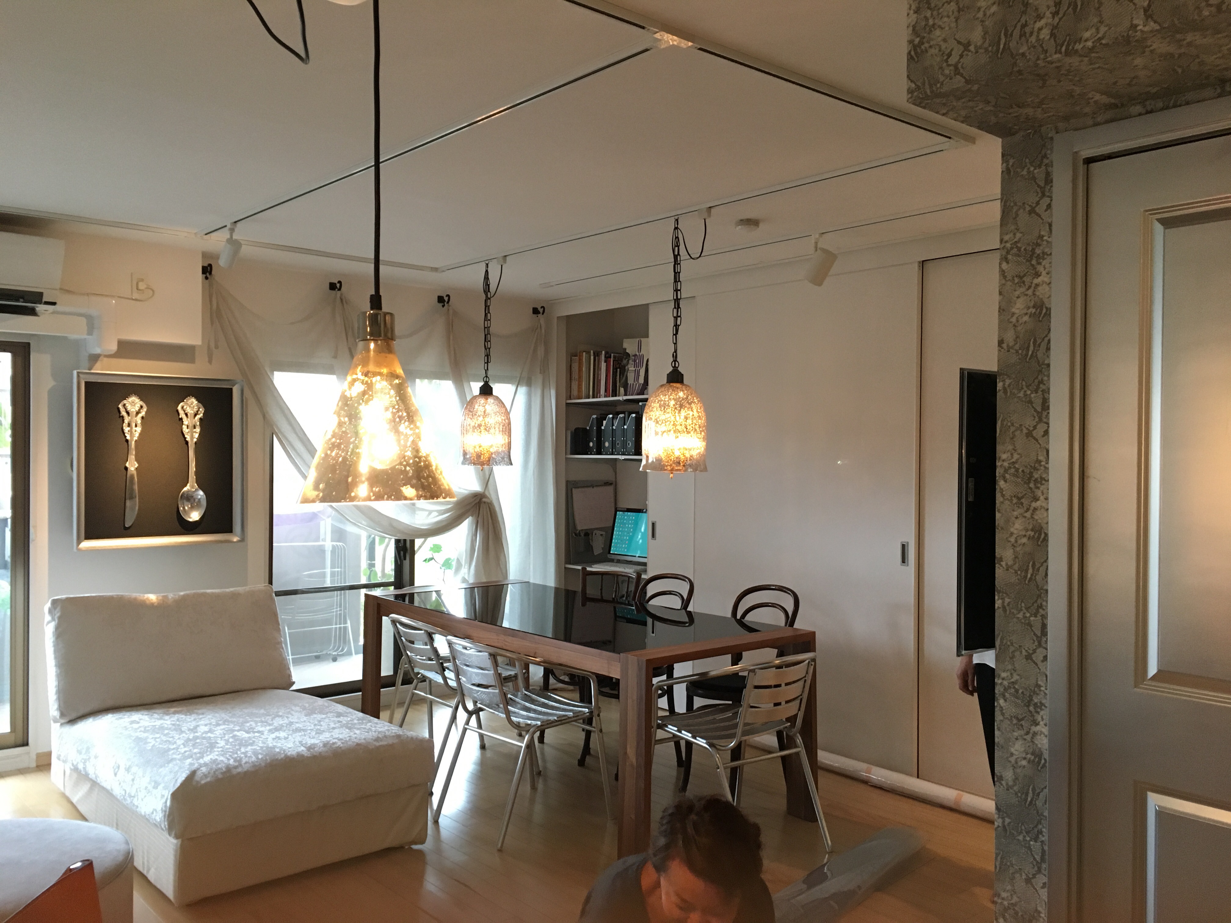 リサブレアではリフォームのアドバイスとカーテン、照明、ソファカバー、クッションなどをさせていただきました。サロンでの写真レッスンや撮影などに使われるということで、シンプルで色を抑えながらのコーディネートはさすがセンス抜群のカメラマンならではの選択です。ダイニングを購入しようかと悩んでおられましたが、以前からベランダで使われていた椅子をお伺いした時に見て、絶対これが合うとアドバイスしたところ、なんとそれがさらにバージョンアップしてシルバー泊とデコパージュ。魅力的で個性的な椅子に変身していました。ここに置くクッションも作っらせていただきましたが、全部ができてしかも撮影したお写真を見るのが楽しみです。これは私が携帯で撮ったものなので、、、 シルバーの扉や床のシルバーの塩ビタイルとの取り合いが写ってないのが残念