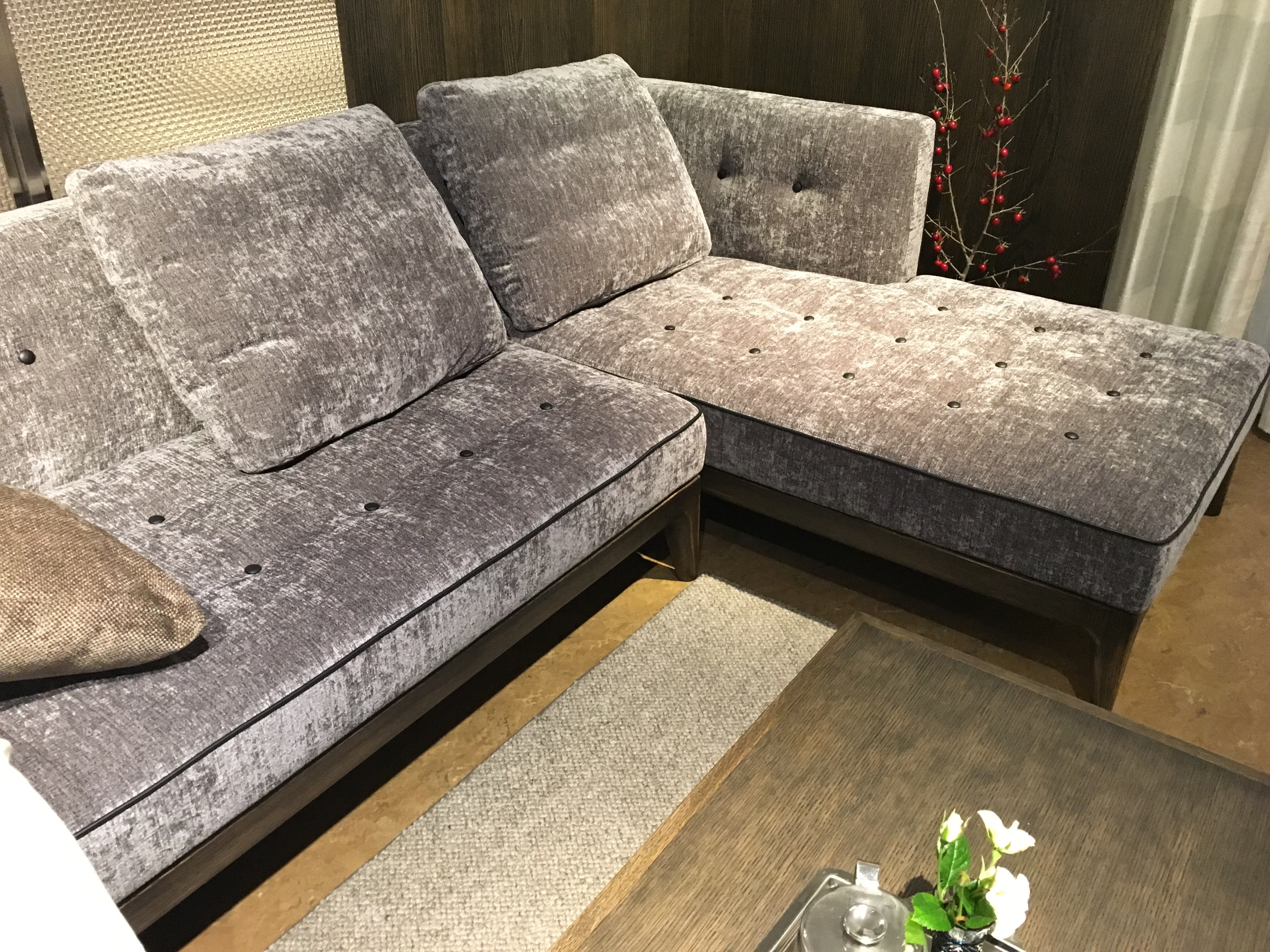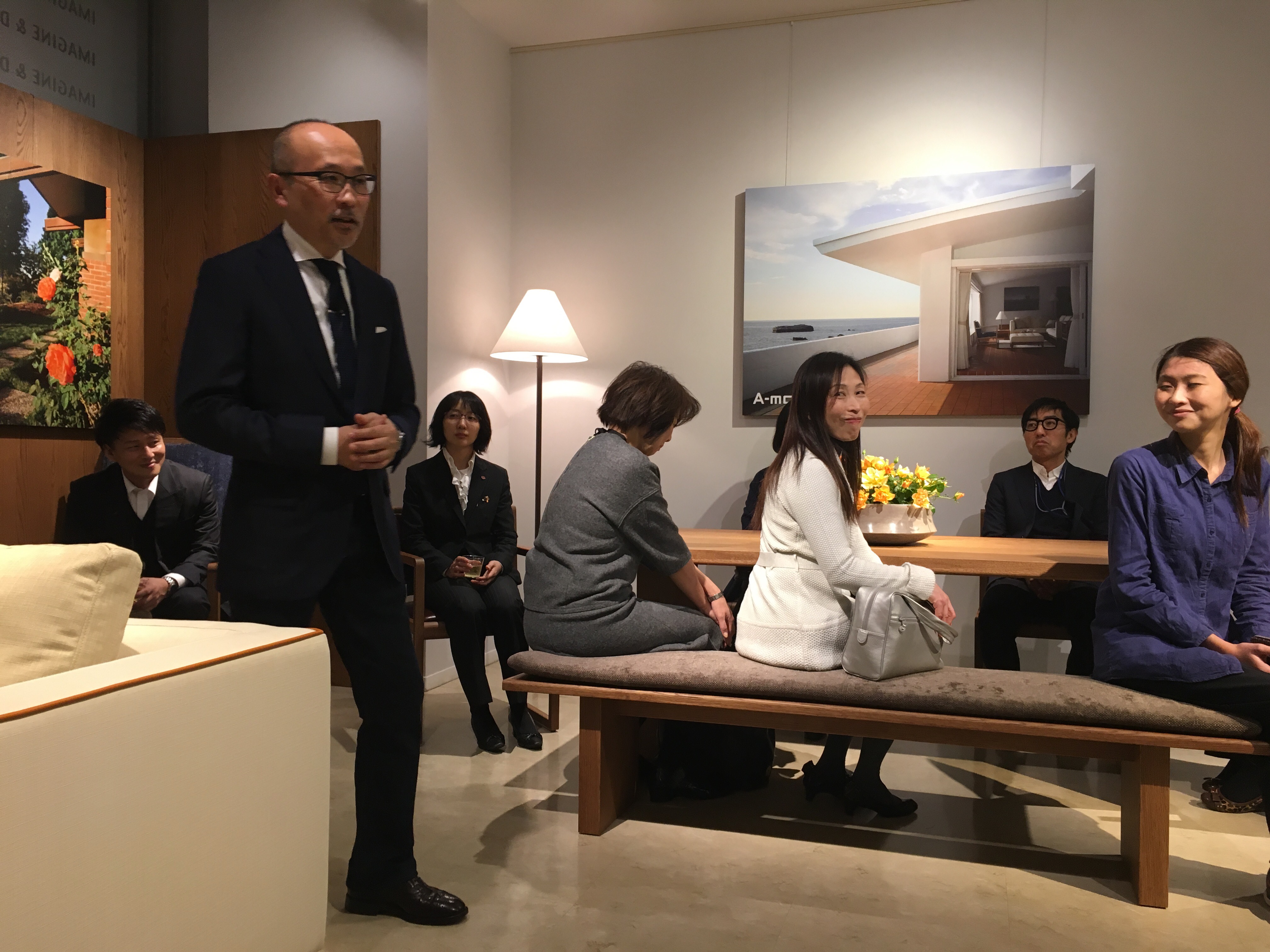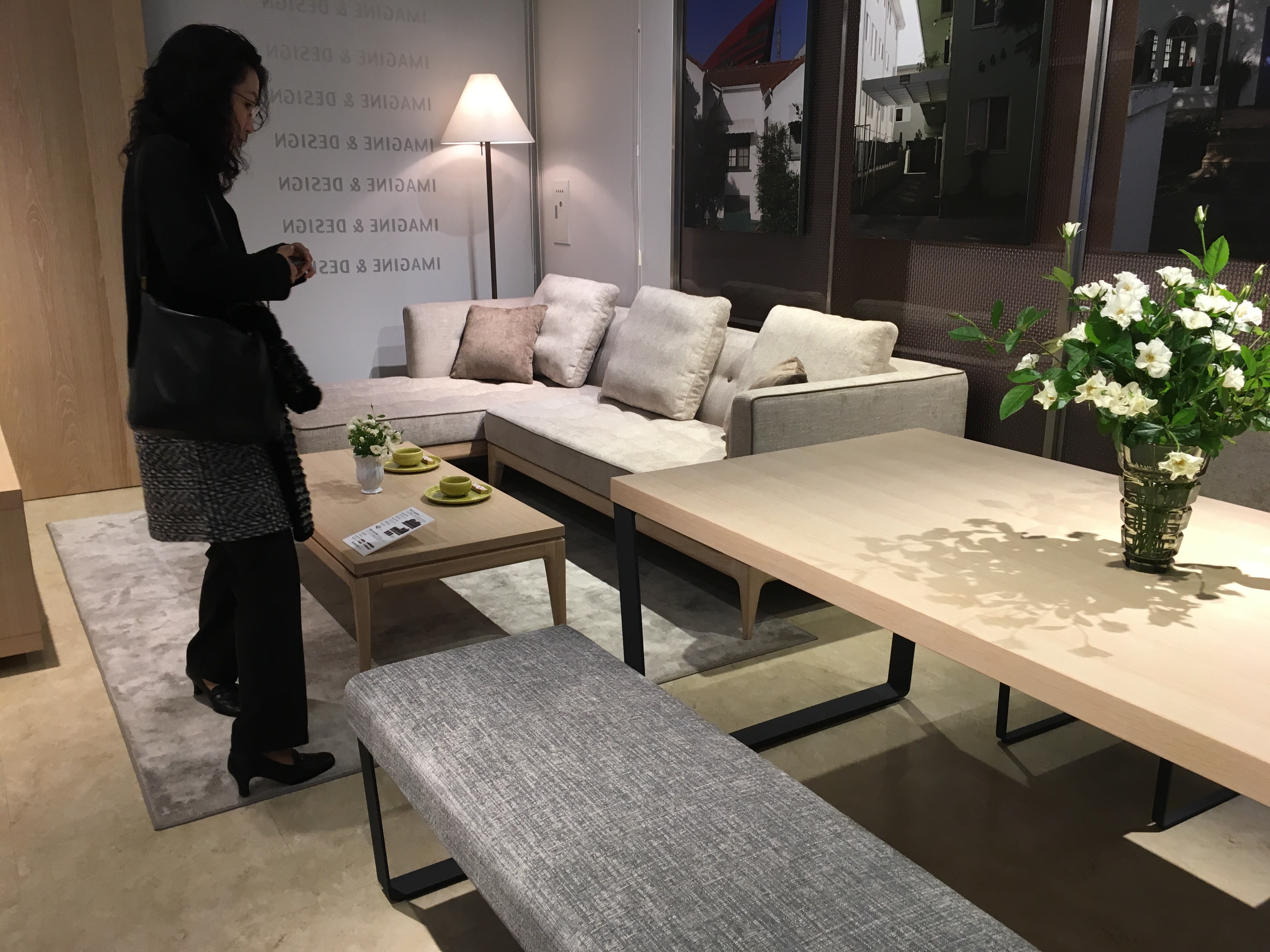 すべて国産で作り、生地も選べるのでお客様にお勧めすることが多いメーカーです。デザイナーの思い入れやコンセプトが明確で、今回の新作はアメリカ西海岸をイメージしたヴィンテージ感覚の家具です。いつもデザイナーの話を聞くのが楽しいのですが、今回はエクレクティックという言葉がついに家具の世界にも使われだした様です。色々なスタイルを混ぜ合わせるという意味なのですが、アメリカのインテリアの世界では10年以上前から使われていたのですが、やっと日本にも定着したかという感想です。一つのスタイルだけに合わせるのはもう面白くない、自由に好きなものに囲まれたい贅沢でリッチな気持の表れですね。