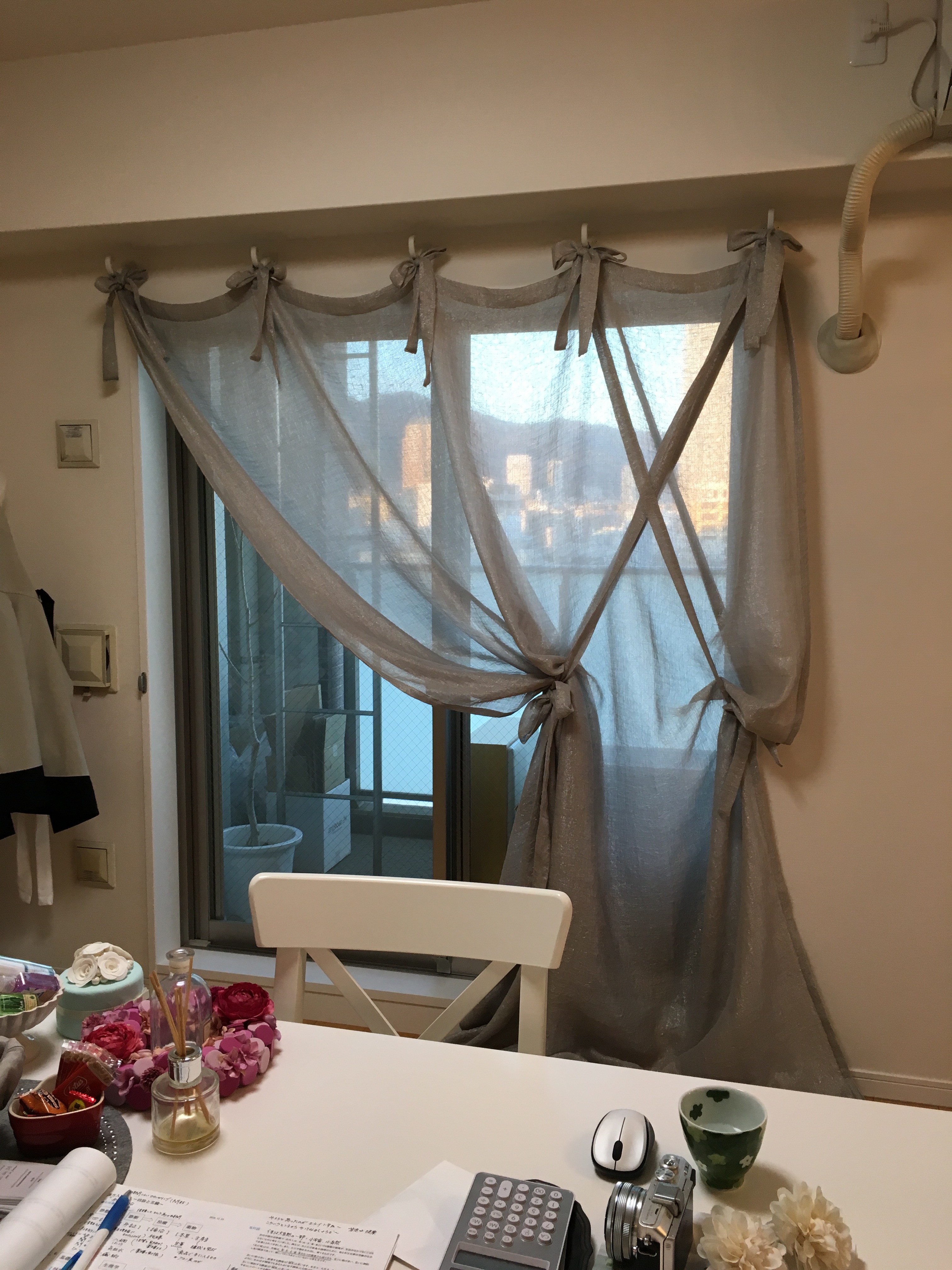 自宅でサロンをされている方のカーテン。リサブレアで最近流行っているKOBEのボリュームがあり光沢があるグレイのレース。最近グレイ色のレースを使うことが多くなりました。あっさりしすぎて寂しいお部屋をガラッと変えます。でもこのグレイ色の微妙な色が大事。