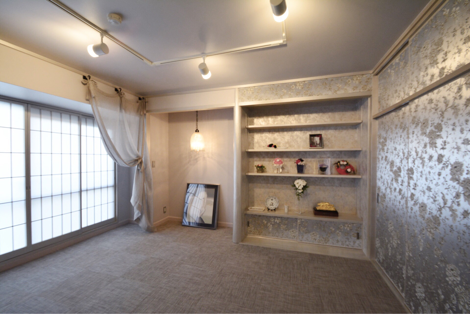 和室のリフォームのコンサルティングさせていただきました。実はカーテンをというご依頼だけだったのですが、お話を伺っていると床柱も全て取り払って完全に洋室にするというお話。何てもったいないのということで床柱や建具は全て残すことに。その代わりシルバーで塗装。壁紙もシルバーの花柄を選んでいただきました。個性的で素敵なセンスをお持ちの方でしたので一旦お好きなものが決まると後はスムーズに決まりました。お花のレッスンをここでされるので、モダンなお花もクラシック名お花もどちらも映えるのではないかと。