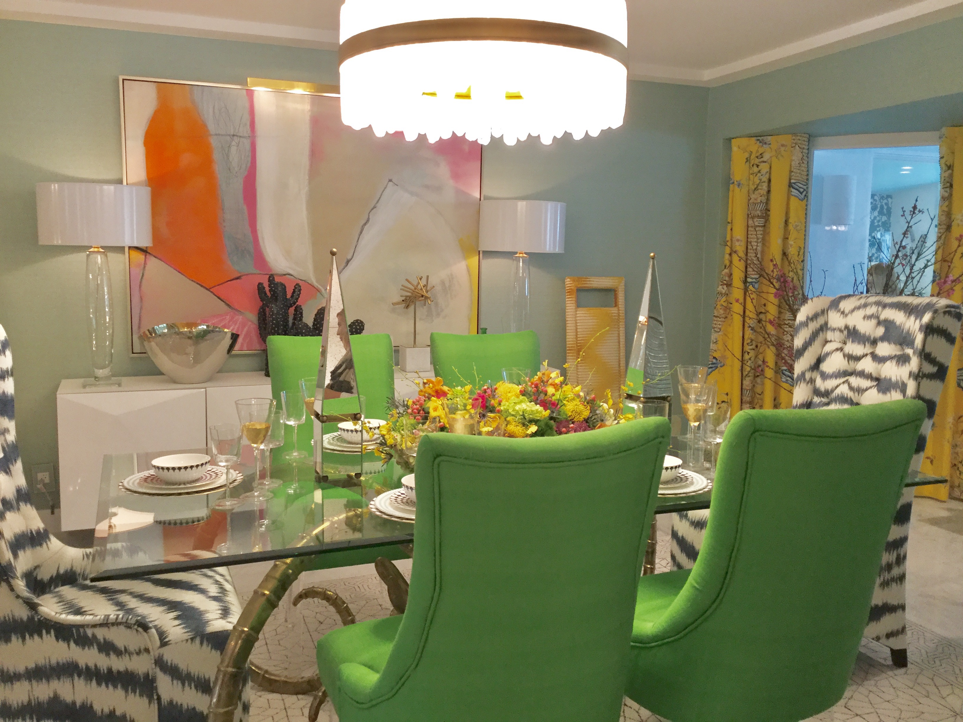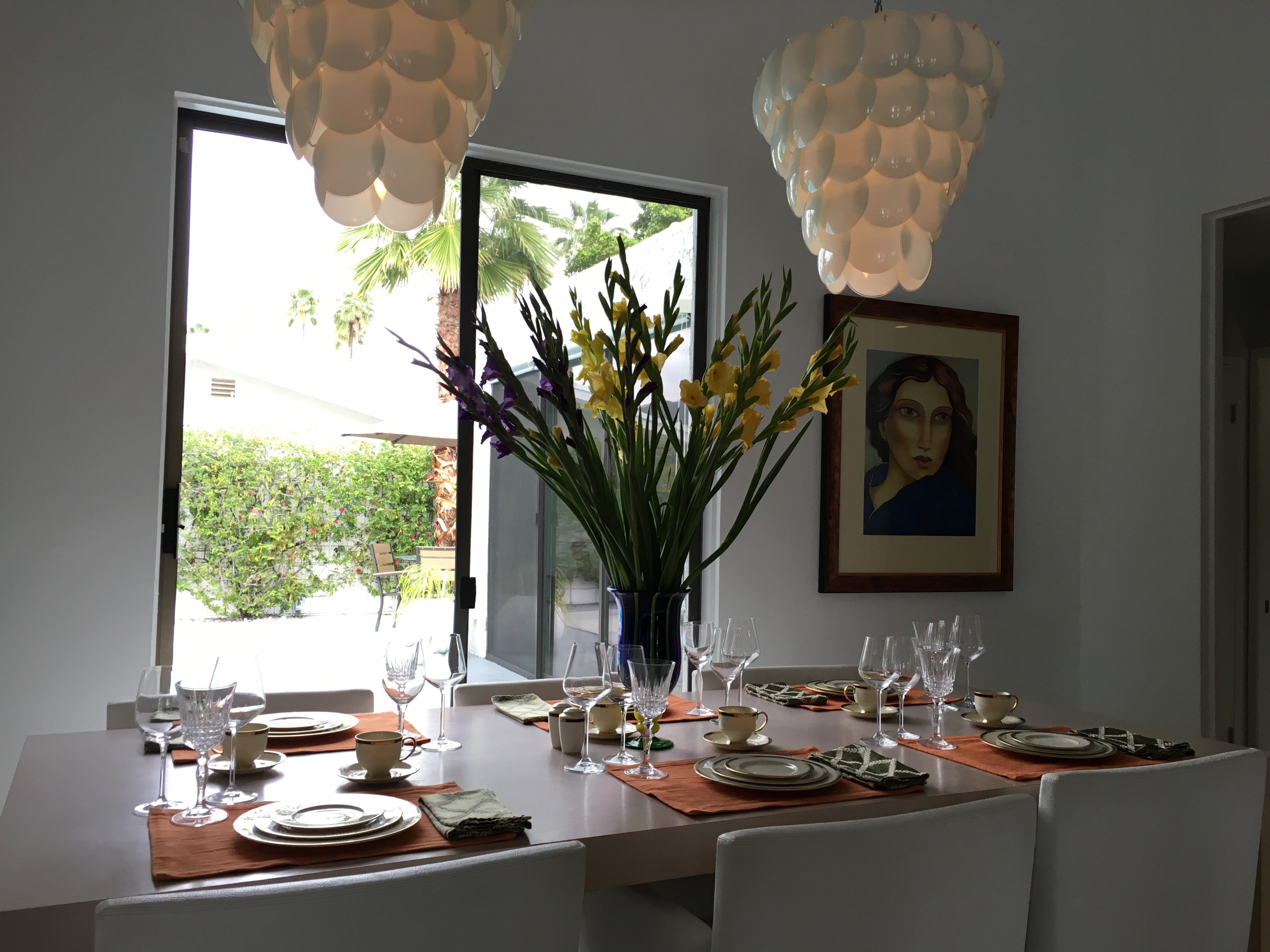 パームスプリングスで開催のミッドセンチュリーウィークにきています。今回は仕事ではなくプライベートで主人と友人が一緒でナパにワインを飲みにいきます。パームスプリングスは砂漠の中の街ですが高い山に囲まれ、下は20度の温度なのにトラムで15分ぐらい上がると雪が積もっていてスキーができるのです。確か35年前に一度きたことがあるのですが、そのときは素敵なオシャレな高級なリゾートという感じだったのですが今は観光地化してちょっとガックリですがモダニズムウィークでお家を回ると眼を見張るほどの新しい刺激を受けました。パームスプリングスはロスから車で2時間ほどで1950年から開発が始まり、しかも1960年ガラスやアルミなど工業製品が多用され有名なミッドセンチュリーの建築で開発されました。しかもゴルフ場が100ほどもあり、プライベートなゴルフ場の周りに家が建築され、大きく開けた窓からはゴルフ場と山の風景、さらにはサボテンなどの植物がうまくガーデニングされ素晴らしい景色となっています。ミッドセンチュリーの建物は平屋でシンプルで、トライアングルの屋根やバタフライの三角の両側が上がった屋根が特徴で、ガラスが張りを挟んで上まででシンボリックな構造になっています。フラット屋根のシンプルな家も多く、シンプルはシンプルでも特徴的なシンダーブロックがアクセントになり、ドアが大きくミッドセンチュリーの色である黄色やブルーがポップなアメリカのミッドセンチュリーをかんじさせます。インテリアはさらにアメリカ独特で、ミッドセンチュリーカラーであるイエロー、ブルー、グリーンがパンチを聞かせ、さらに色を混ぜてもオッケーです。内部の構造はシンプルで窓が大きく、ドアも塗装のフラッシュドア、どのお家も何回もリノベーションを繰り返していますが、このシンプルさは変わっていない。そこに大胆なカラーを入れたり、ジオメトリックな壁紙も特徴です。ここにはモダンアートがうまく配置され、お部屋のインテリアエレメントが色もバターンもまざりあってさらにヴィンテージの照明や置物がコンテンポラリーなアメリカンミッドセンチュリー感で住むのが楽しくなるようなインテリアです。