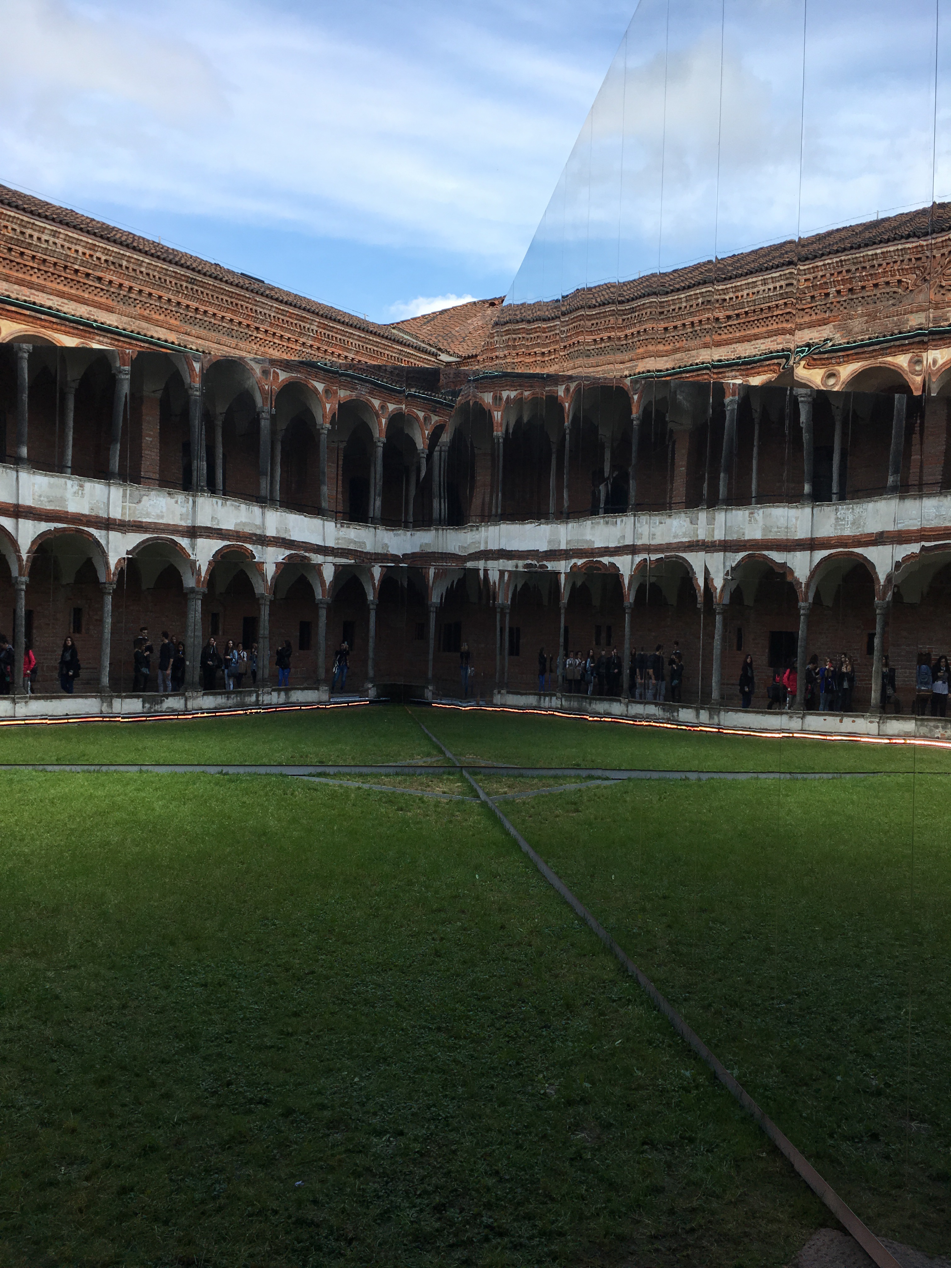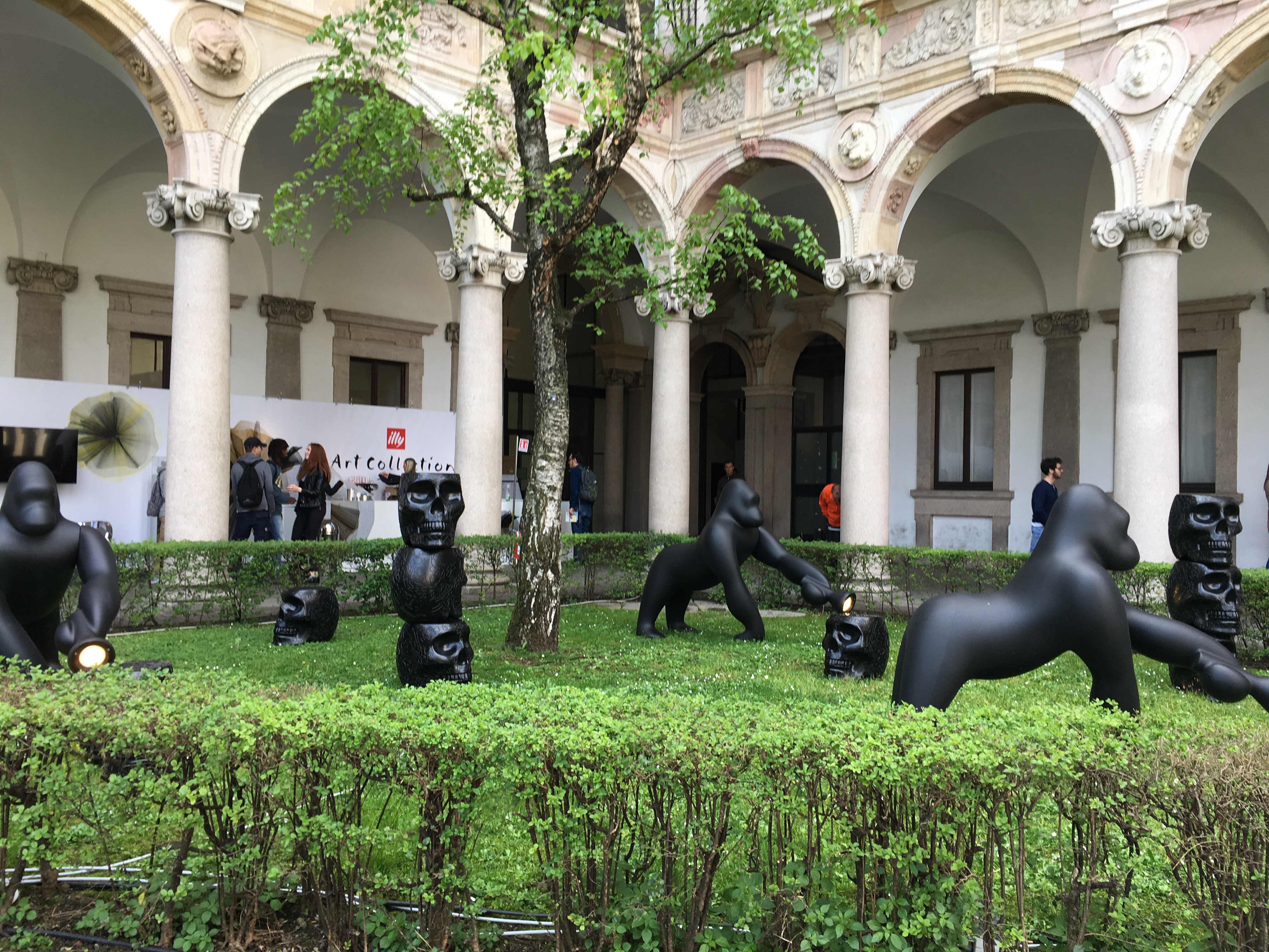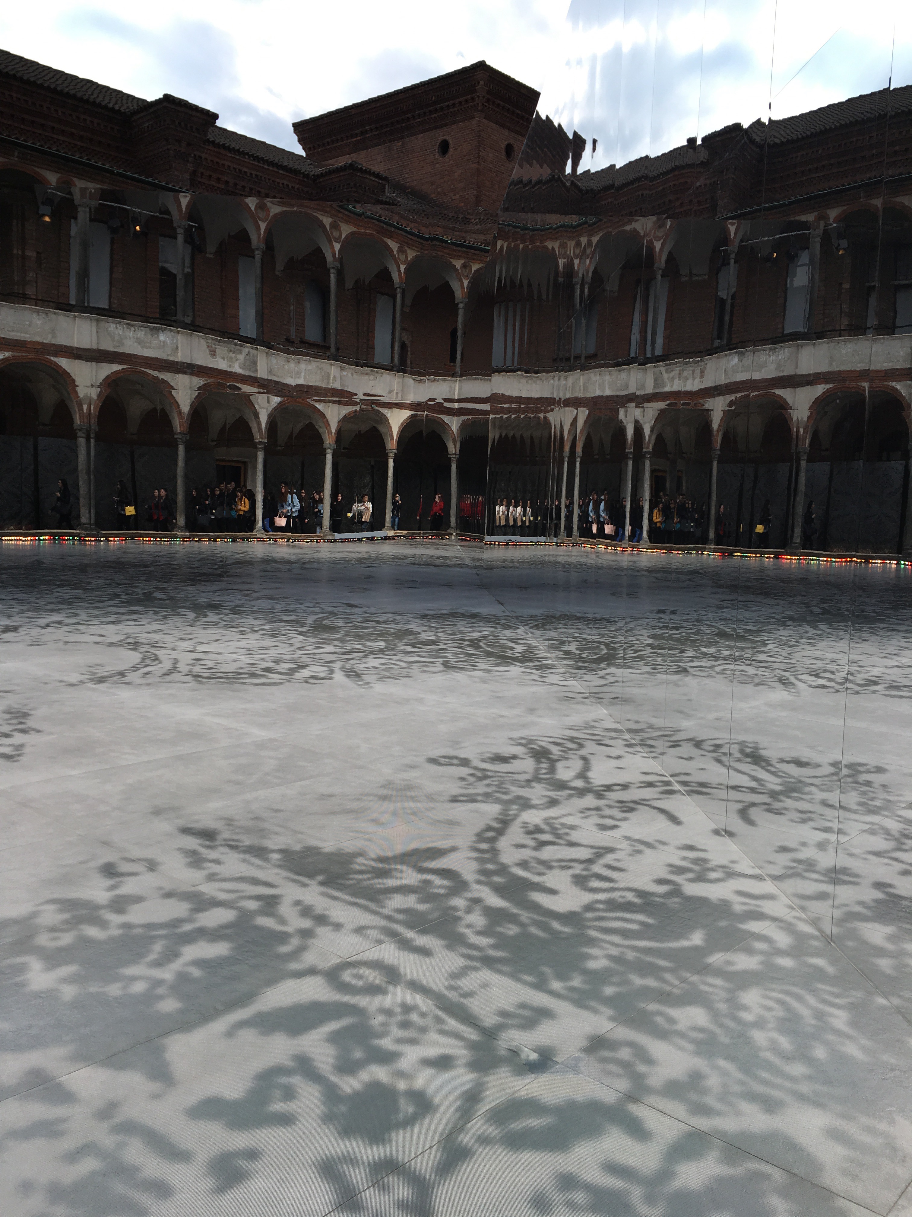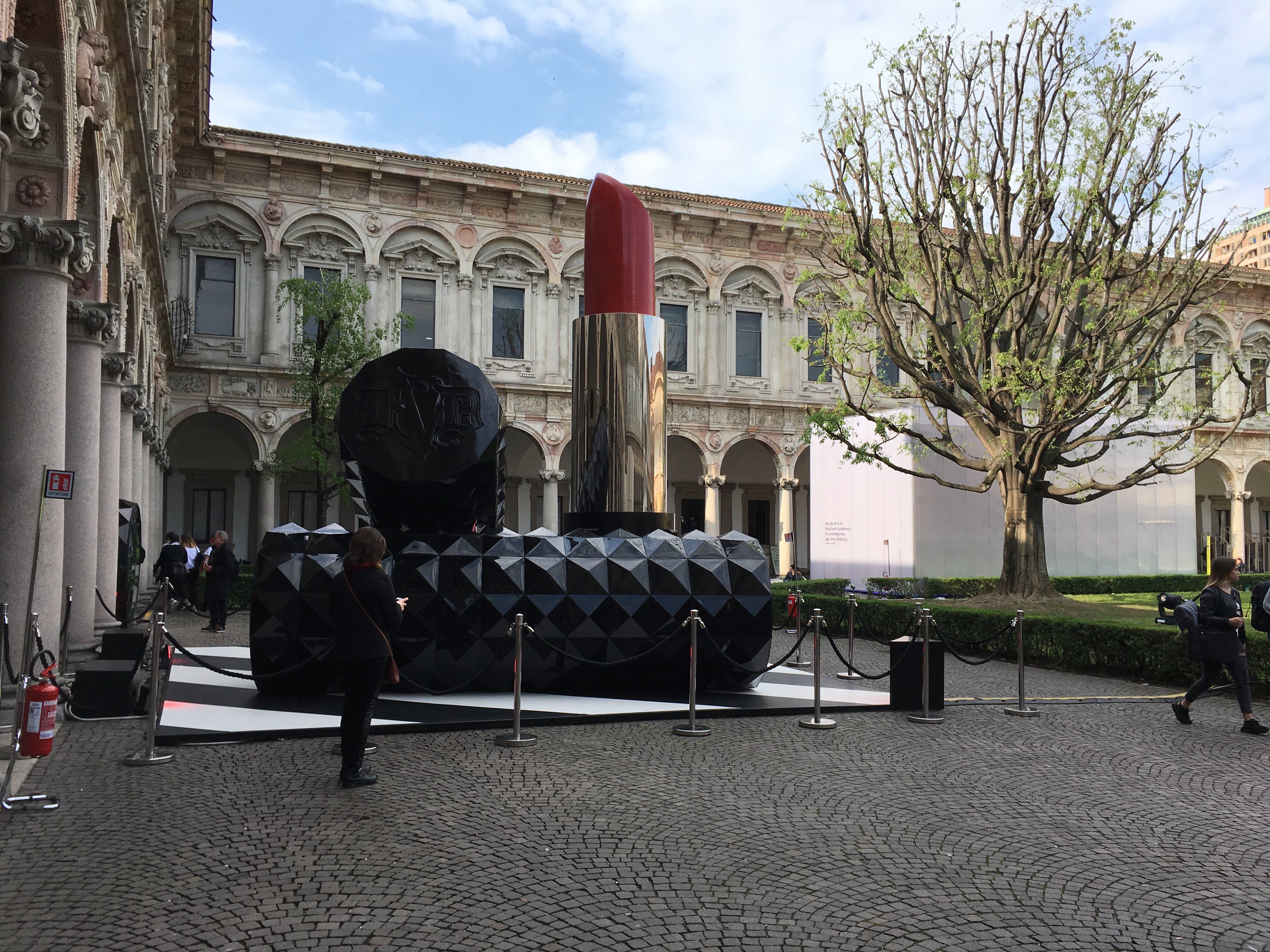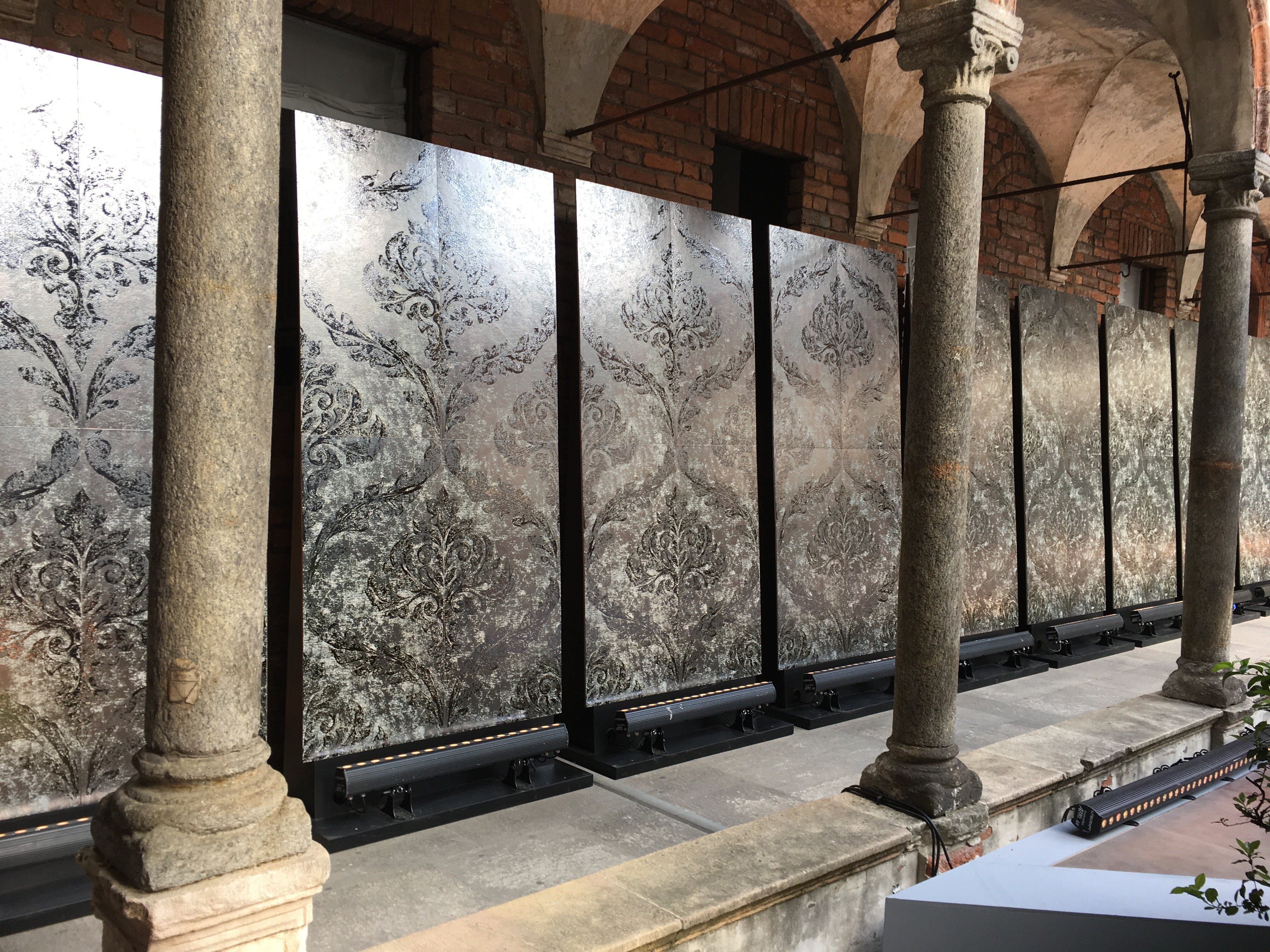 ミラノ大学でのバックヤードの巨大展示。スポンサーはタイルメーカー、ダマスクの大きなタイルが展示されています。この写真どうなっているかわからないでしょ。直角に交わった巨大ミラーが中庭の廻廊を映し出し、そこに屋根のクラシックな建築がうまく溶け込んでいるんです。