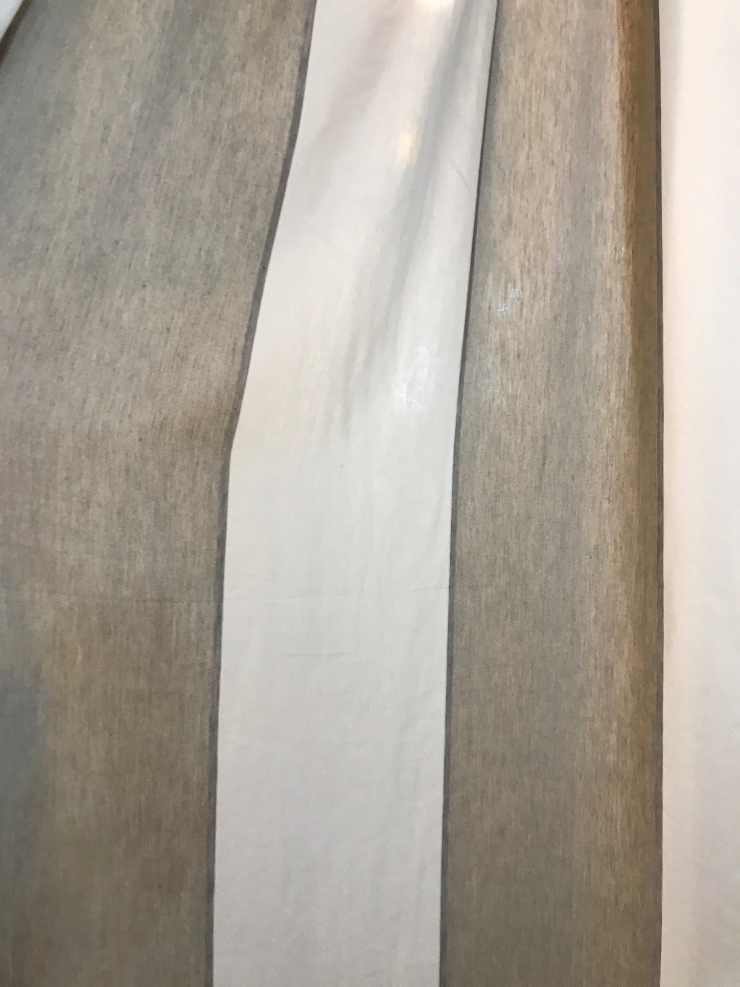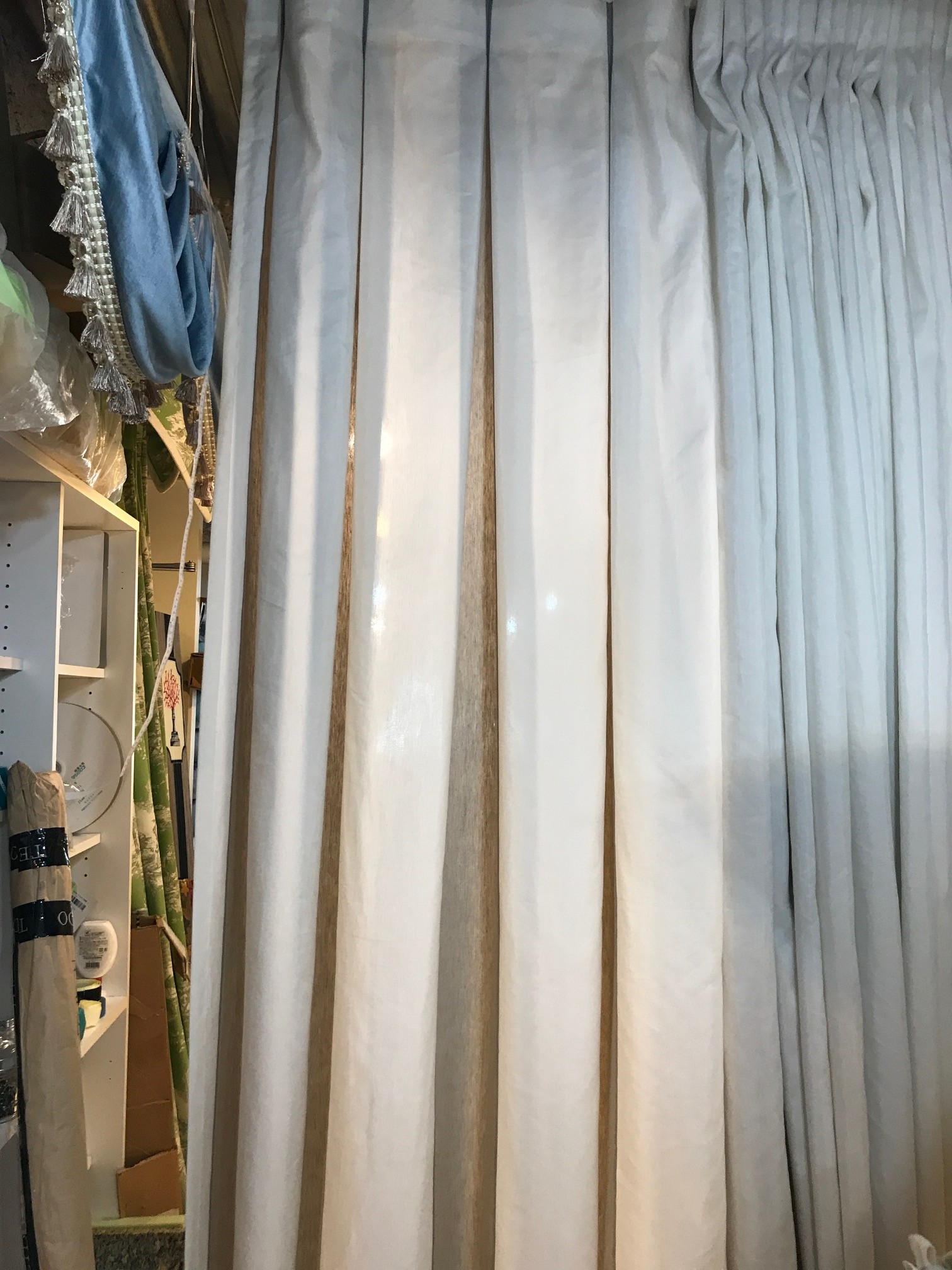 ストライプの柄が大きいので、柄をいかした「おくひだ仕上げ」で縫製しています。カーテンBOXには不向きですが、カーテンレールの場合はプリーツが前に出るのでとても綺麗な仕上がりになります。爽やかな肌触りのリネンの風合いもいかされます。