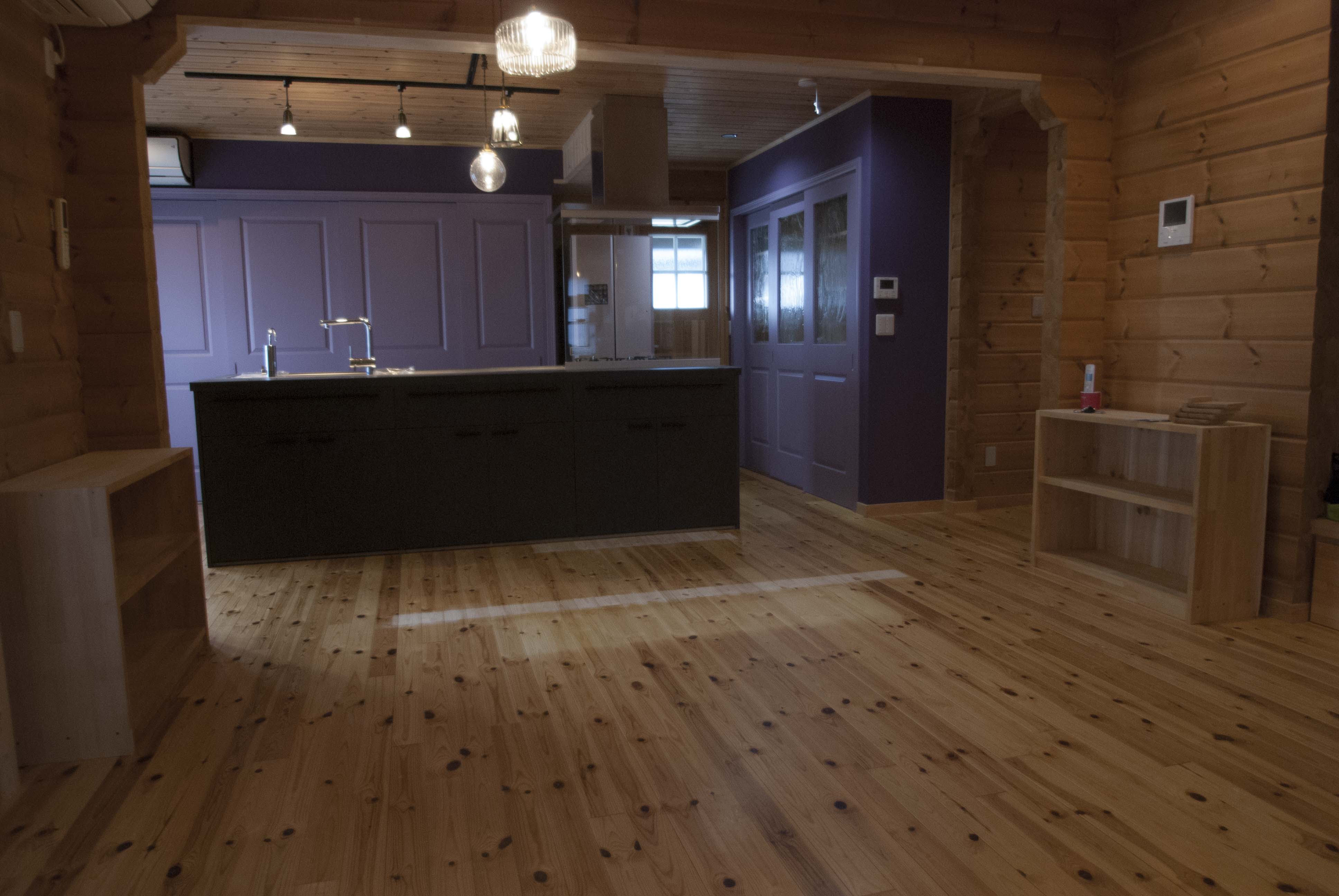 問題はキッチンの背面にあたる窓。この窓を生かすために、収納の中に窓を入れ込み、扉を工夫してフル開口できるようにしました。扉の色は施主様のご希望でパープル。これがログハウスの色と合っています。さらに照明はすべてダクトで、いろいろな形の照明を吊り下げています。これも新鮮です。まさに組み合わせの妙でしょう。