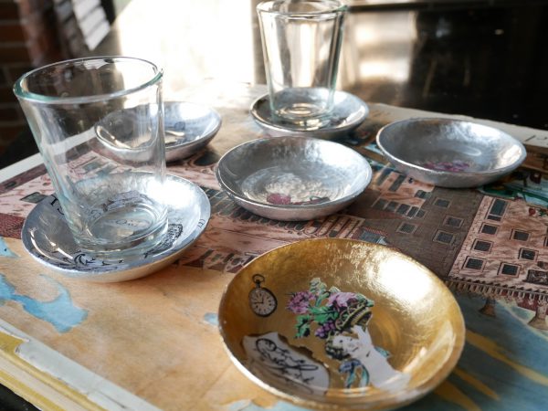 グラスを置いて撮影してみました。リサブレアでは、グラスの水分でテーブルを痛めない為に、いつも豆皿をコースター代わりに使っています。