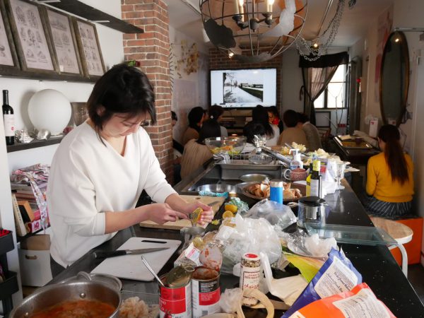 セミナー中にお料理を準備してくれているCross Food三島智子さん。美味しい食材を探し求め、世界中を飛び回っています。今回はイタリアのレモンオイルや、無添加の野菜出汁ブロックを使って美味しいパスタやサラダを振舞って下さいました。