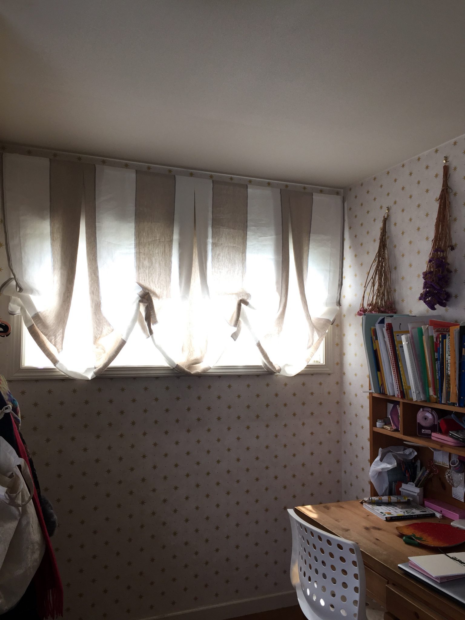 壁紙はそのままでカーテンはリサブレアで人気のdifferenceのストライプをバルーンシェードとフラットカーテンスタイルにしました。ゴールドの星の壁紙に太いベージュのストライプでナチュラルな大人っぽい雰囲気になりました。