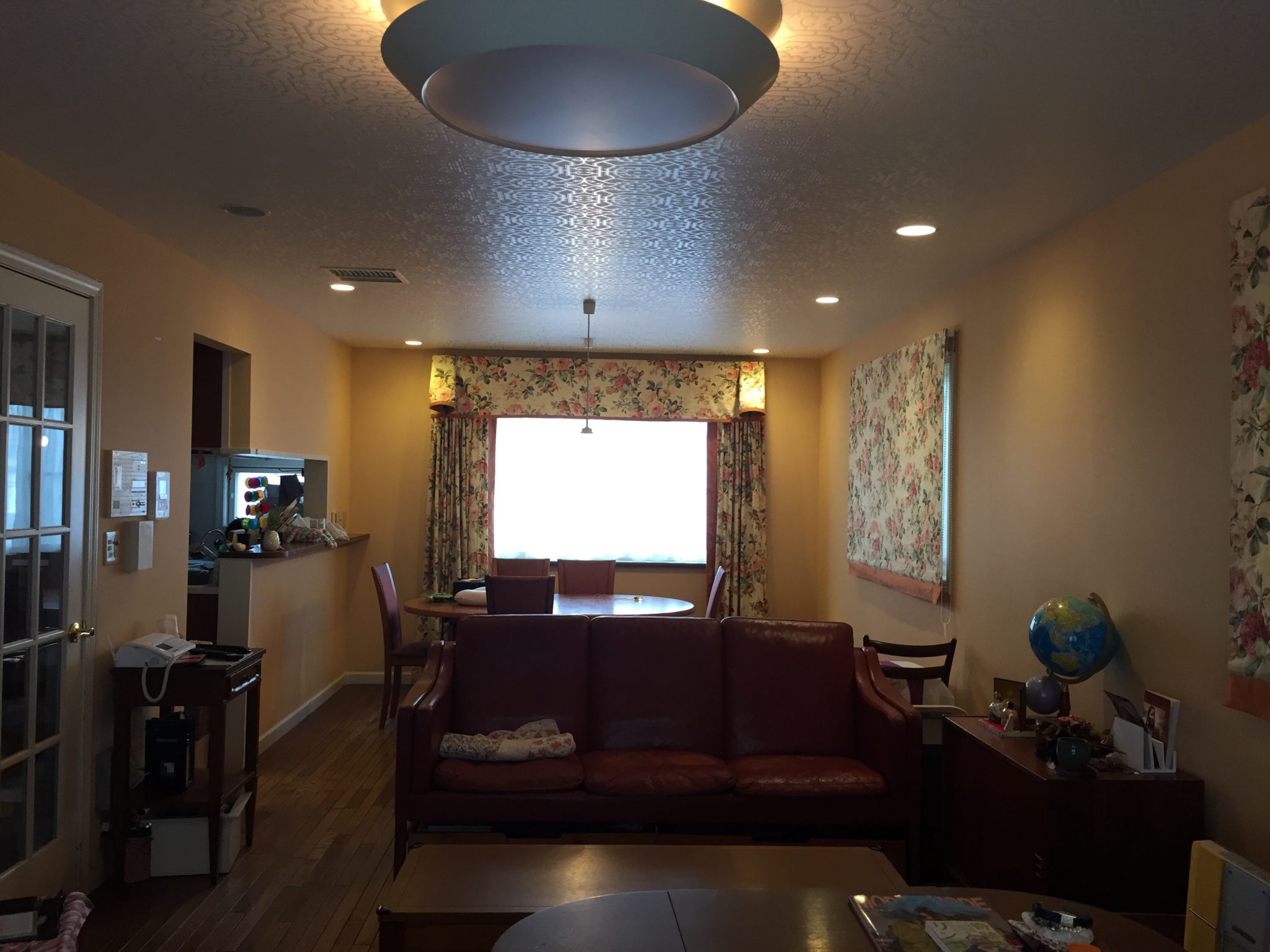 決定した壁紙のお色はお客様がお好きな2色です。リビングダイニングの殆どは黄色の壁で一部をアクセント使いでピンクにしました。一般的にアクセントクロスとして貼られているのが壁の一面を違う色や柄の壁紙にすることが多いです。 今回はデザインとしてピンクと黄色の貼りわけの位置をあえて扉より横にずらしました。そうするとお部屋の真ん中で好きな2色を楽しめるので気分も変わります!カーテンは新調というご提案もさせていただきましたが、お客様から今のカーテンをとても気に入っているのでこれを使って欲しいということになりリメイクいたしました。