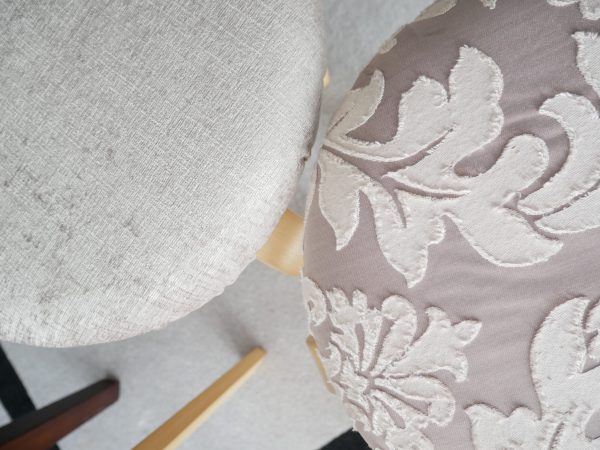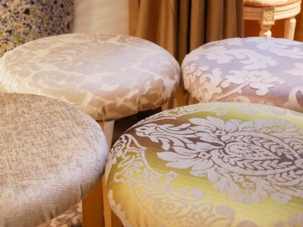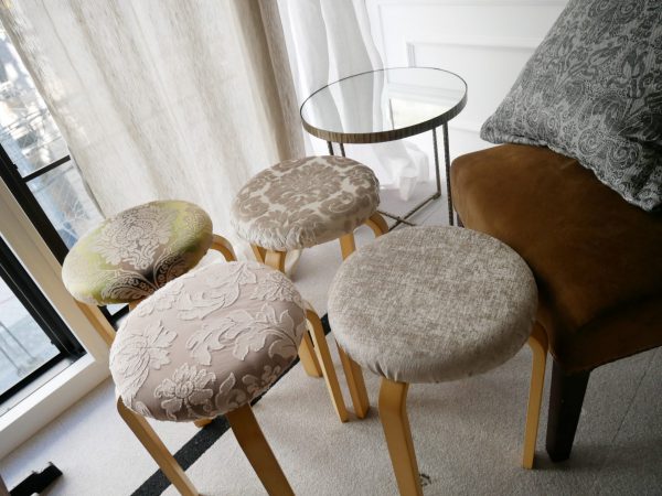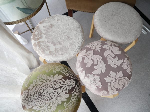 こちらが完成した4つのスツール。今回はダマスクが人気でしたね!エレガントなお客様にぴったりな生地をお選び頂きました。