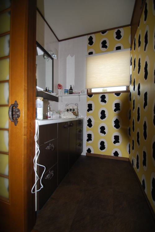 洗面所も楽しく。 洗面ユニットも取ってを変えるだけで見違えるように素敵になります。ついでに引き戸の引手も変えてしまいました。床が塩ビタイルなのですがハラコなのです。よくぞこの商品をだしてくれましたとメーカー様に感謝です。塩ビタイルなので冷たい感じがなくて手入れが簡単。
