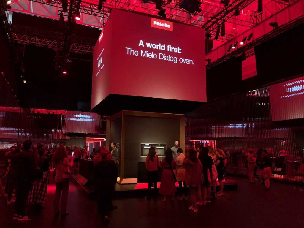 その極め付けが、高級なシステムキッチンには必ず組み込まれている高級オーブンのブランドMiele。今年のサローネのテーマが「キッチン」だったこともあり、様々なブランドのキッチンにこちらのMieleが入っていました。それは兎も角、Miele自体の演出に驚きました。設定された音楽と照明演出が始まり、オーブンのデモンストレーションが始まります。新機能自体は良く理解できなかったのですが、ここまでやるか?!という感じ。それほど各ブランドが、ミラノサローネをとても重要な場として捉えていることを実感。ちなみに私は観客の一人として完全にMieleのファンになってしまいましたよ 笑。