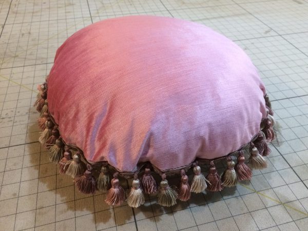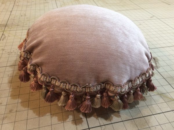 円形のクッションはあまりオーダーを頂かないのですが、このように周りにフリンジを付けるとマカロンみたいな可愛く仕上がります。