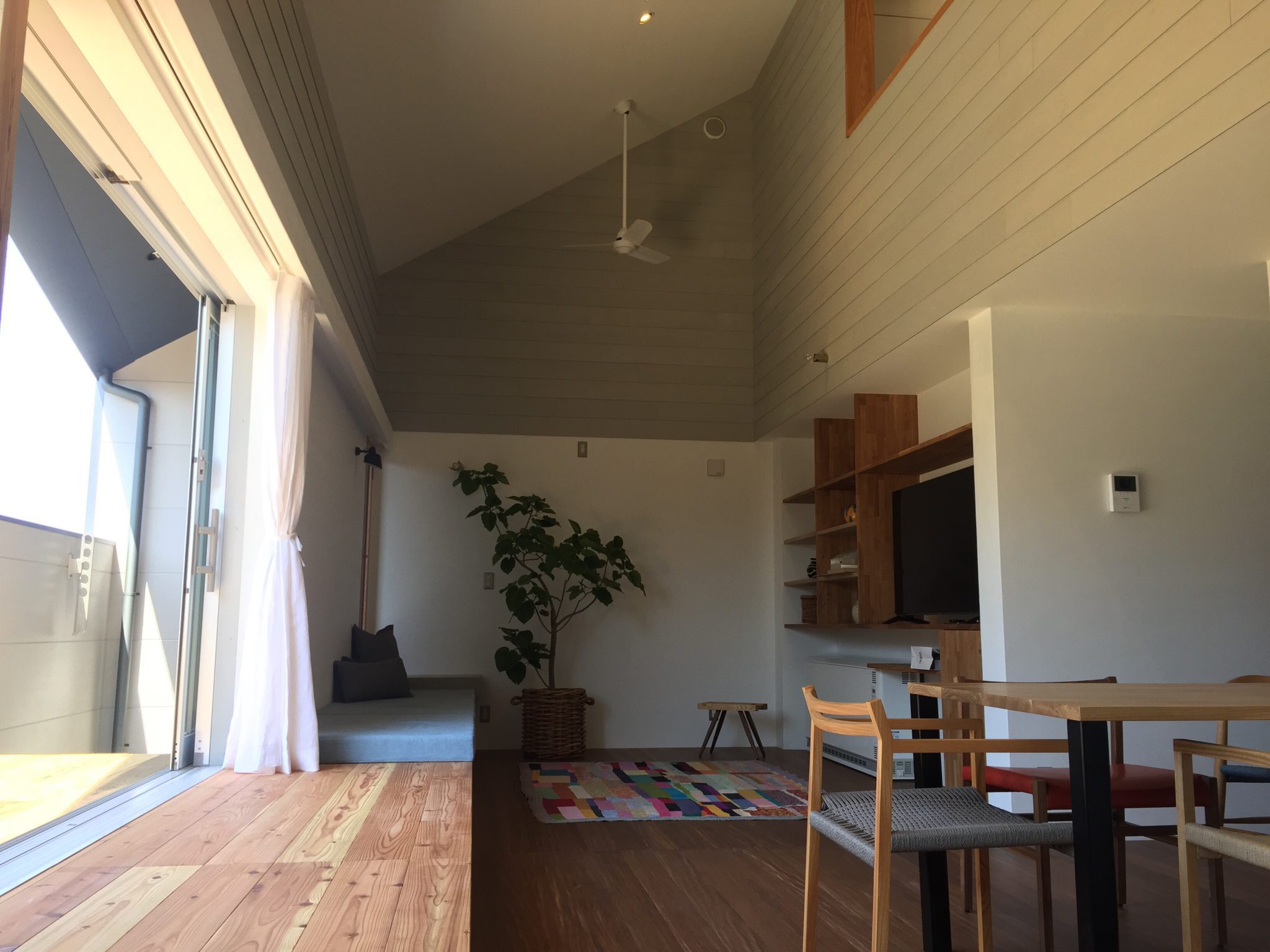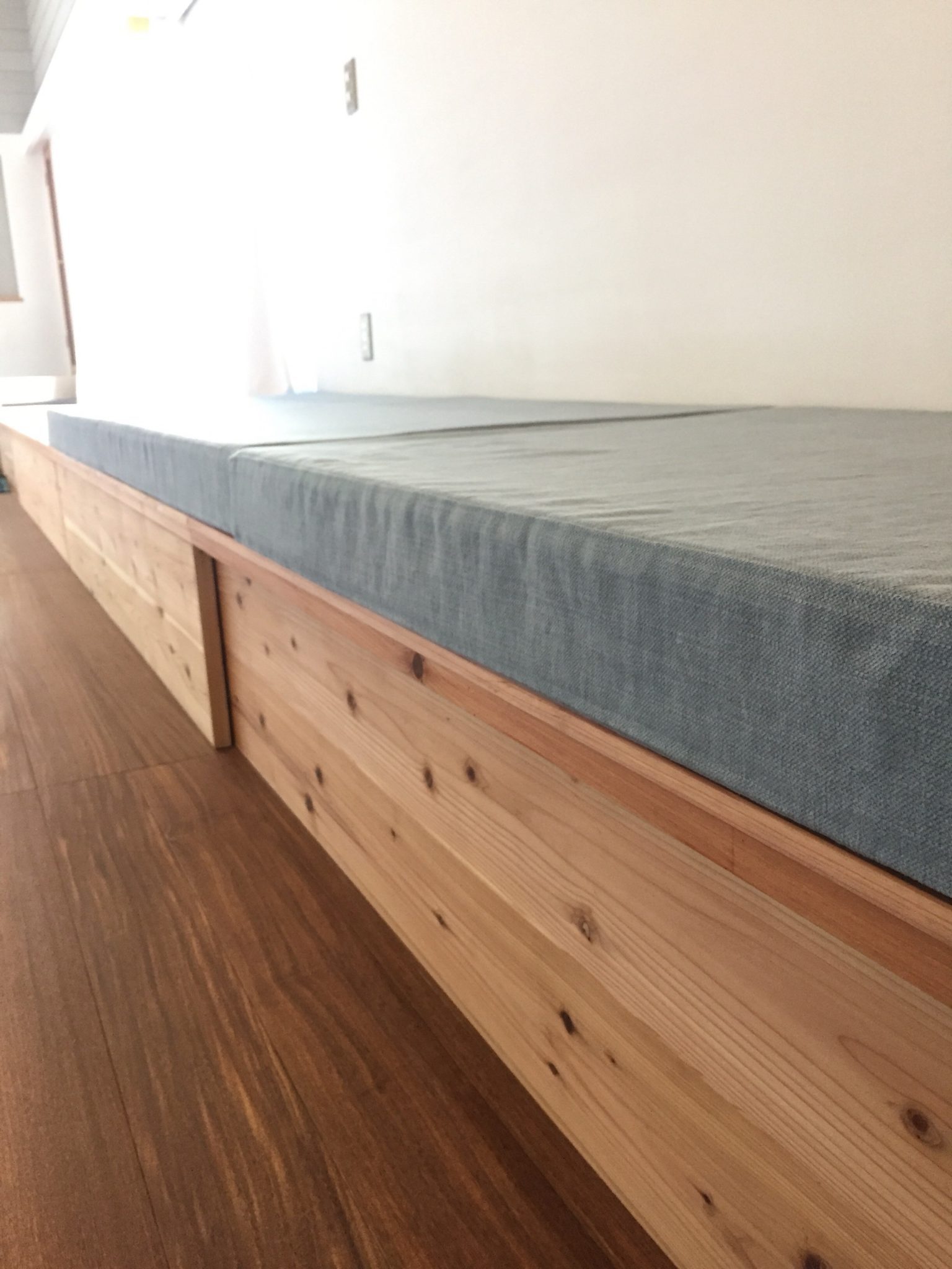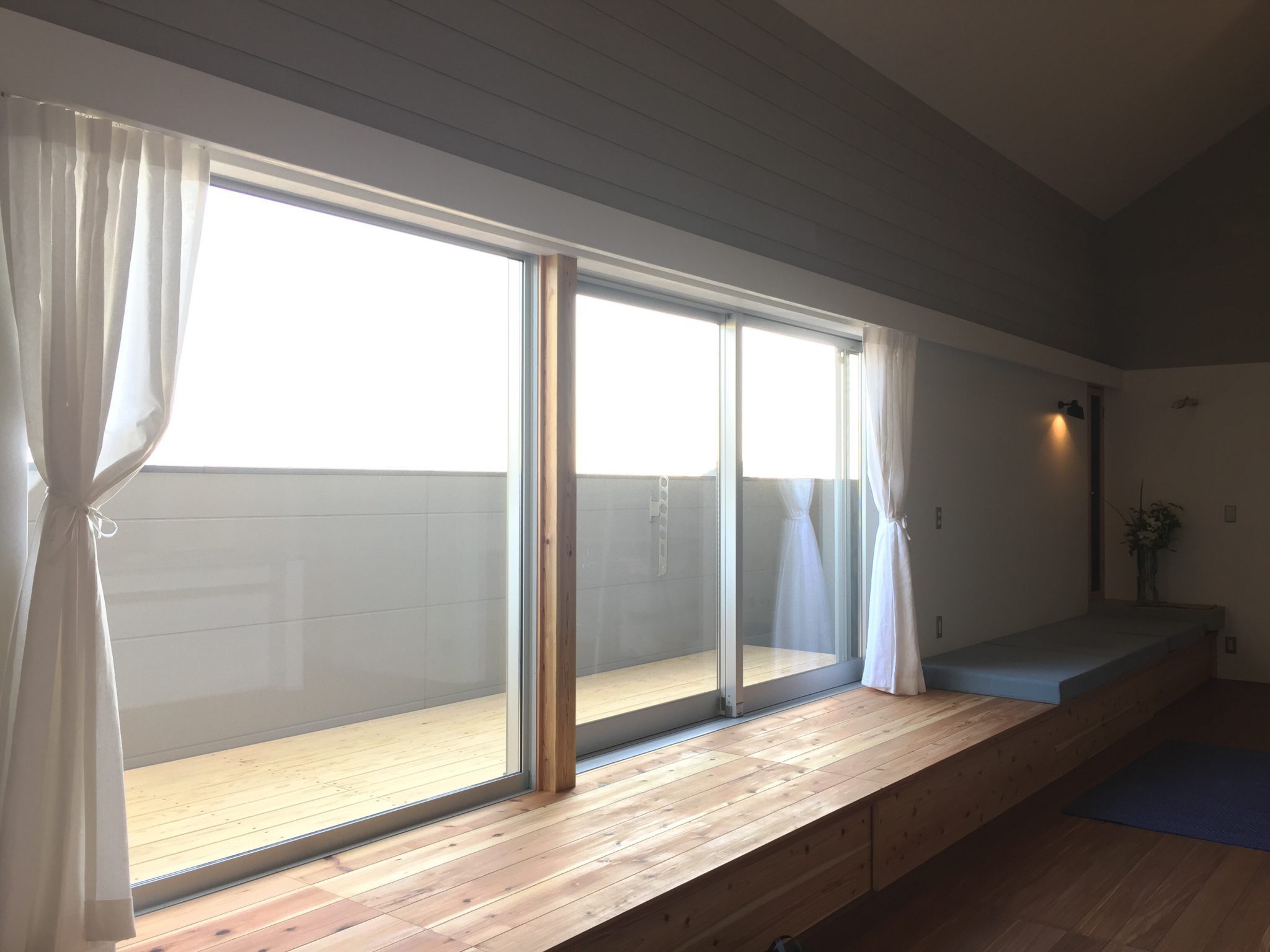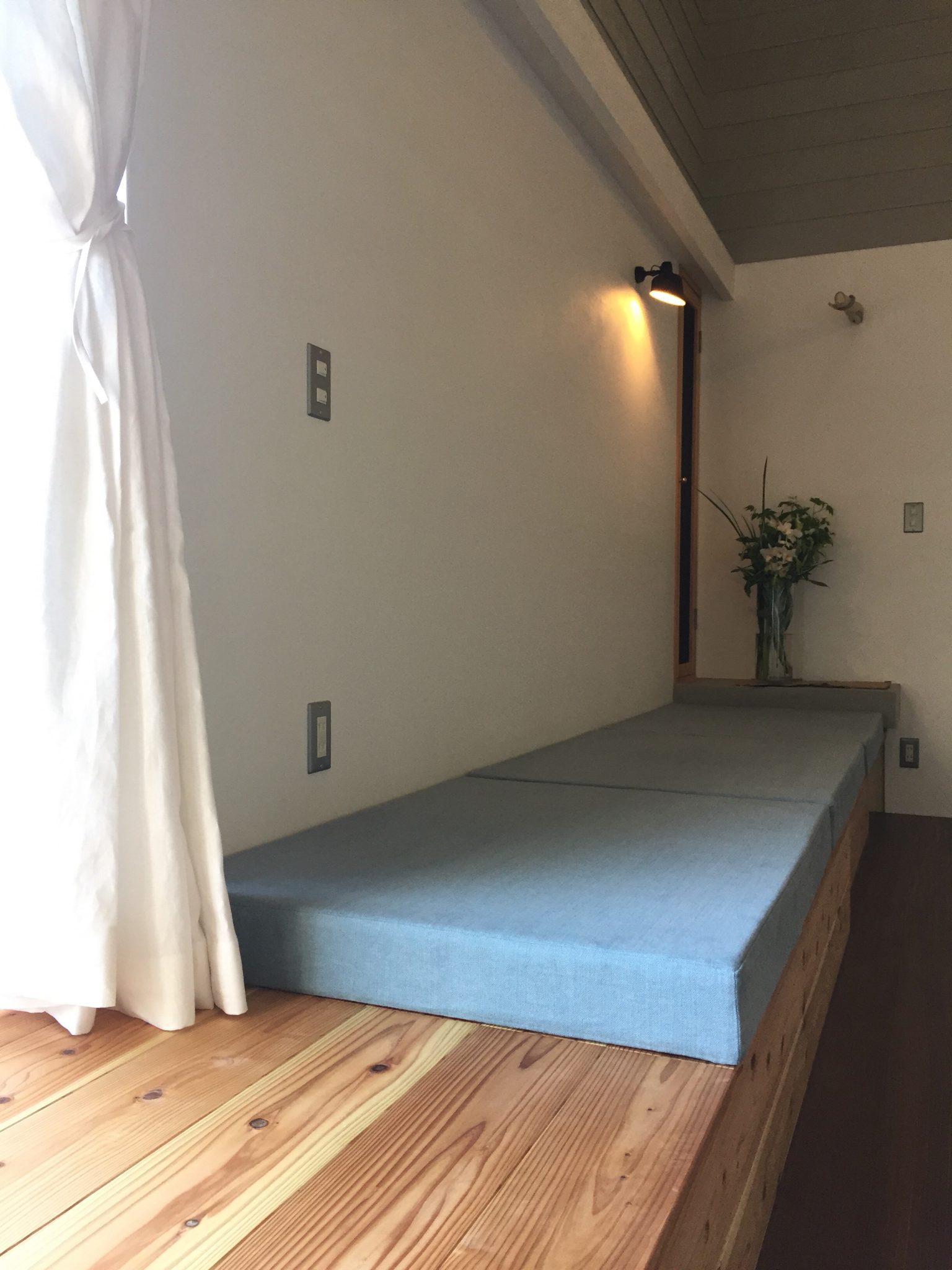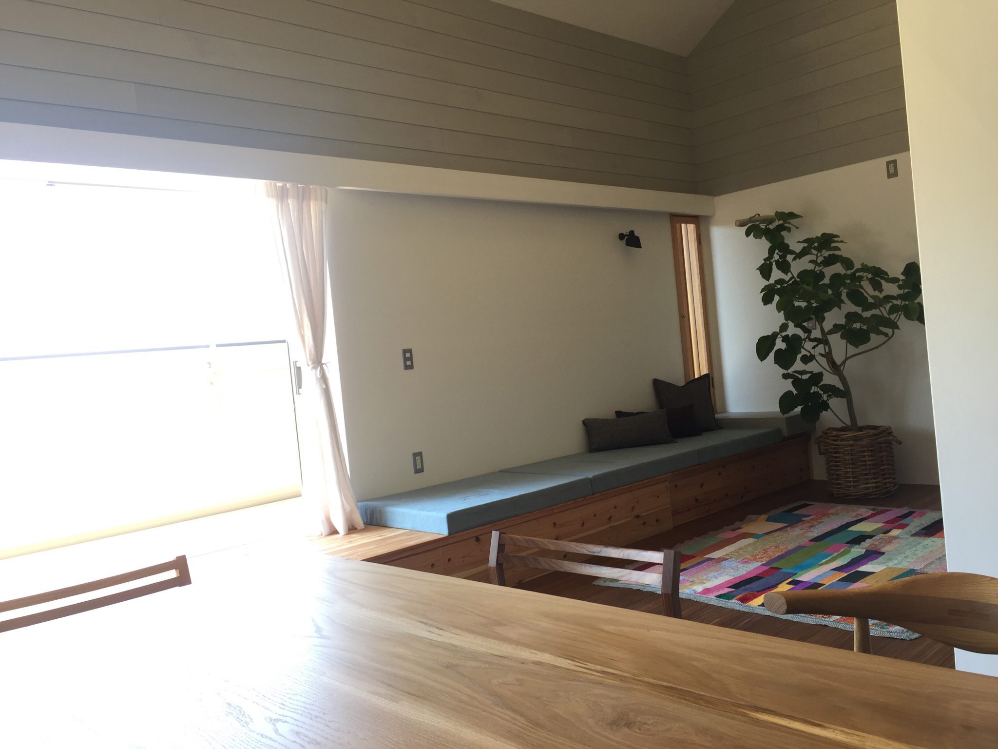 開放感のある広いリビングダイニングにバルコニーと並行してあるステップフロアの一部に置くベンチシートとカーテンのオーダーをいただき設置に行ってきました。カーテンはリネンのホワイトでシンプルなフラット仕上げ。写真の左側奥に写っているブルーがベンチシートです。写真では小さく見えますが、実は横3mあります!