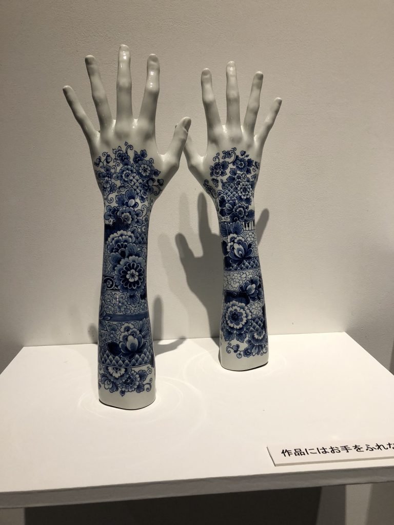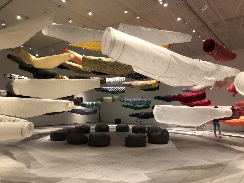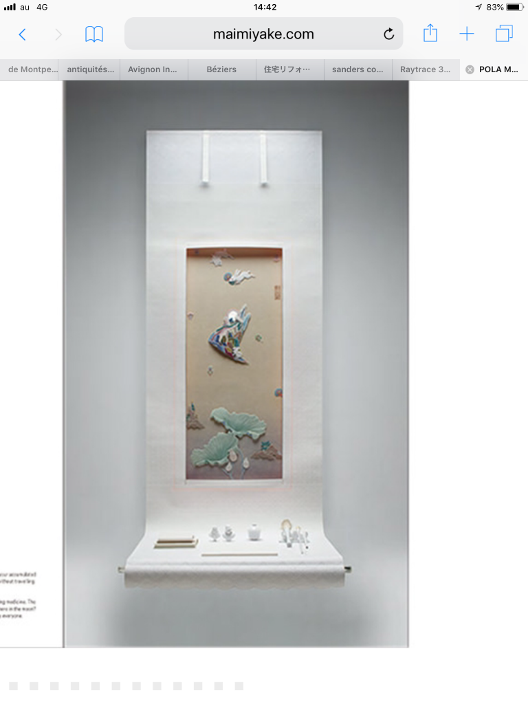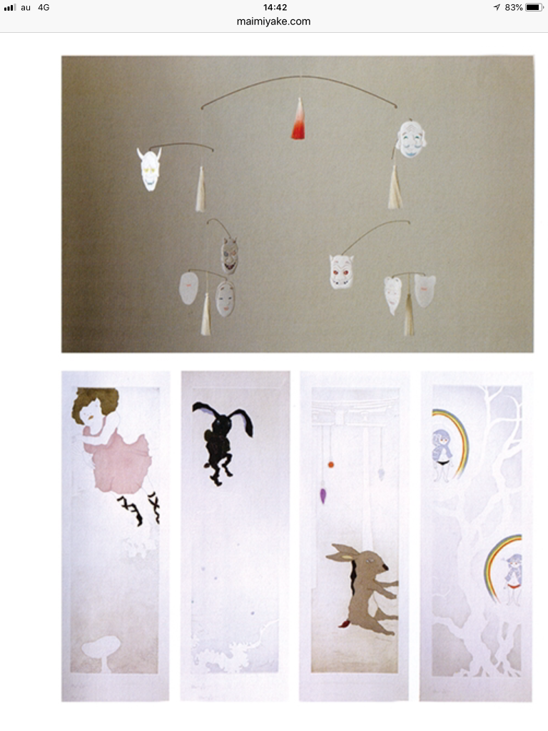どういう関連があるのか、オランダのデザイナー、マルセルワンダーとテキスタイルデザイナー須藤さんそしてアーティストミアケマイの3人展、展示の内容も全く関連する内容が無いようにおもうののですが、この組み合わせ合わせが意外に面白かった 。マルセルはデザインとは人に意外性や驚きを与えるものという言葉通り、デザイン美的には楽しい意外性が溢れています。そして須藤さんは日本の伝統技術である布作りに工芸の価値を再発見させる素晴らしいデザインを生み出し、それをアートにまで発展させた 表現をしています。このお二人は名前も業績も知っていたのですが、ミアケさんとは?全く知らなかったのですが、展示が 凄すぎて前のお二人の展示が飛んでしまうほどの感覚を味わいました。画家?モダンアート?インスタレーション?作家?掛け軸にえがかれた絵が日本やアジアやヨーロッパが混ざり合ったような、現代と過去が混ざり合った様な、宗教的なものを喚起させるような。そしてインスタレーションは五感に訴えるような驚きがあるのです。残念ながらミアケマイさんのものは写真を撮れなかったのですが、ウェブサイトから抜粋をしました。ミアケマイさんの表現がまた面白かった。人間は口から肛門までが考える葦である 。なるほどと思わせる展示なのです。
