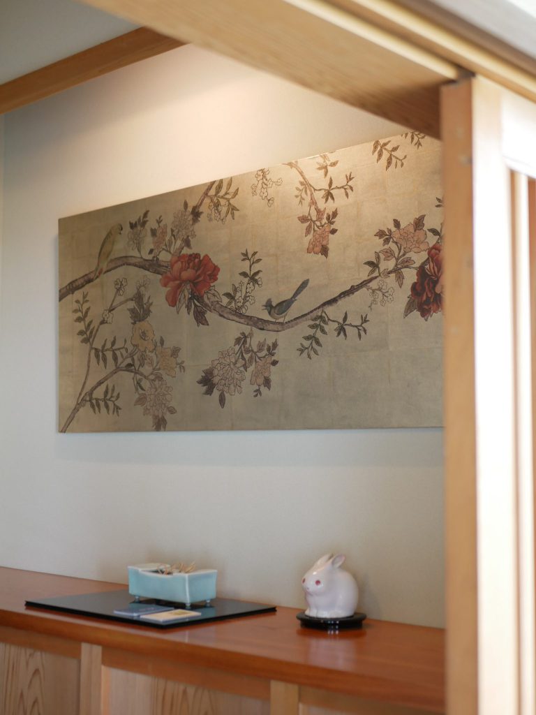先ず、玄関までのアプローチの階段を登っていくと、そこには丁寧な格子戸があります。格子から漏れる光の美しさがお好きだと仰ってました。その玄関にリサブレアにてご購入頂きましたシノワズリのアートパネルを飾って頂いております。純和風とのコントラストが実に美しいのが印象的でした。真っ赤なお花を入れて欲しいとのリクエストがございましたが、その「赤」が和の空間に映えており華やかな印象でした。