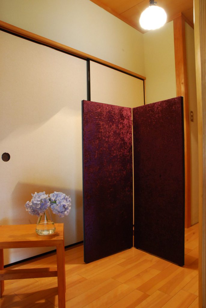 そして玄関からの廊下を抜けると、診療室がございます。その診療室の入り口に弊社で制作させて頂いたパーティションを置いて頂きました。こちらは当初、リビングルームのソファの両サイドに置く予定だったのですが、仮置きとして現在は襖の手前側にございました。