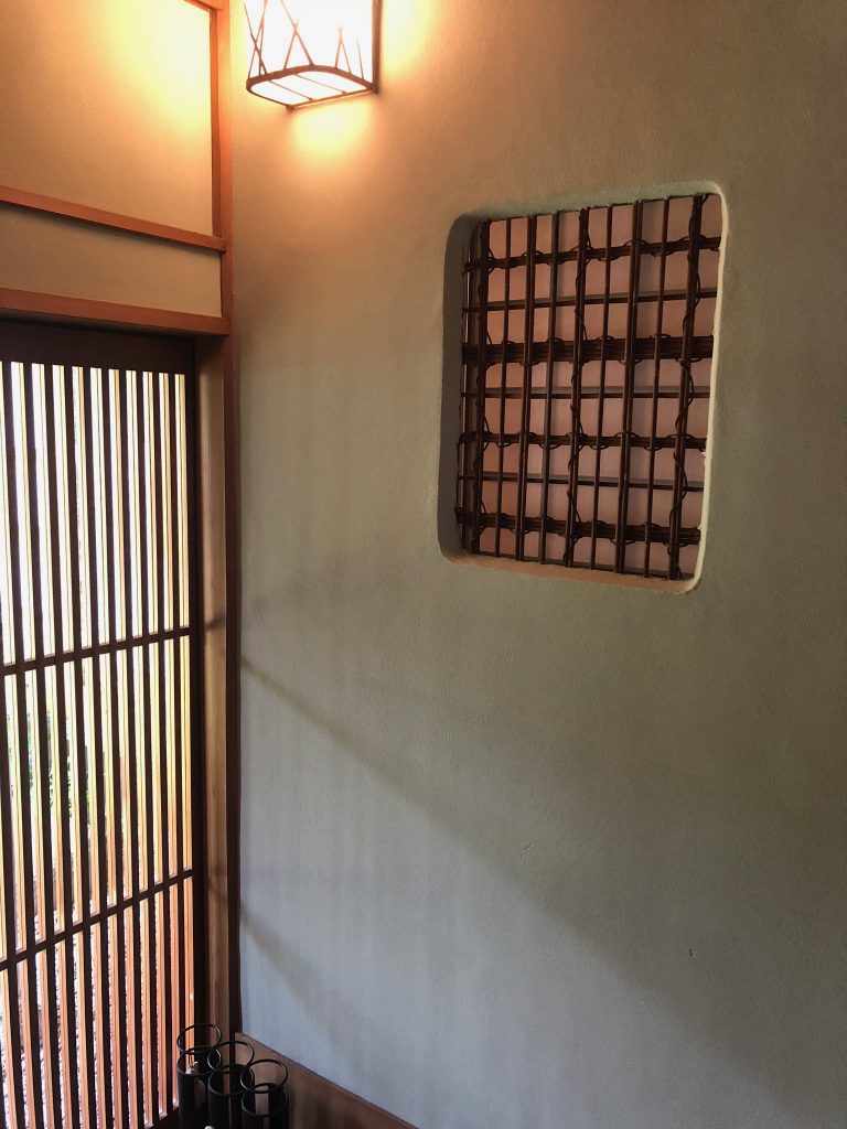 下の写真はシノワズリのアートパネルと反対の壁面。玄関側、廊下側と意匠が違います。廊下側から見ると障子になっていますが(写真は下記にあり)、その和紙によりプライベートな空間を確保しつつ、光を和らげて魅せる効果もあるのでしょうね。夜にお邪魔したいなぁー。壁面にも格子から見える影が土壁に柔らかい影が映し出されております。