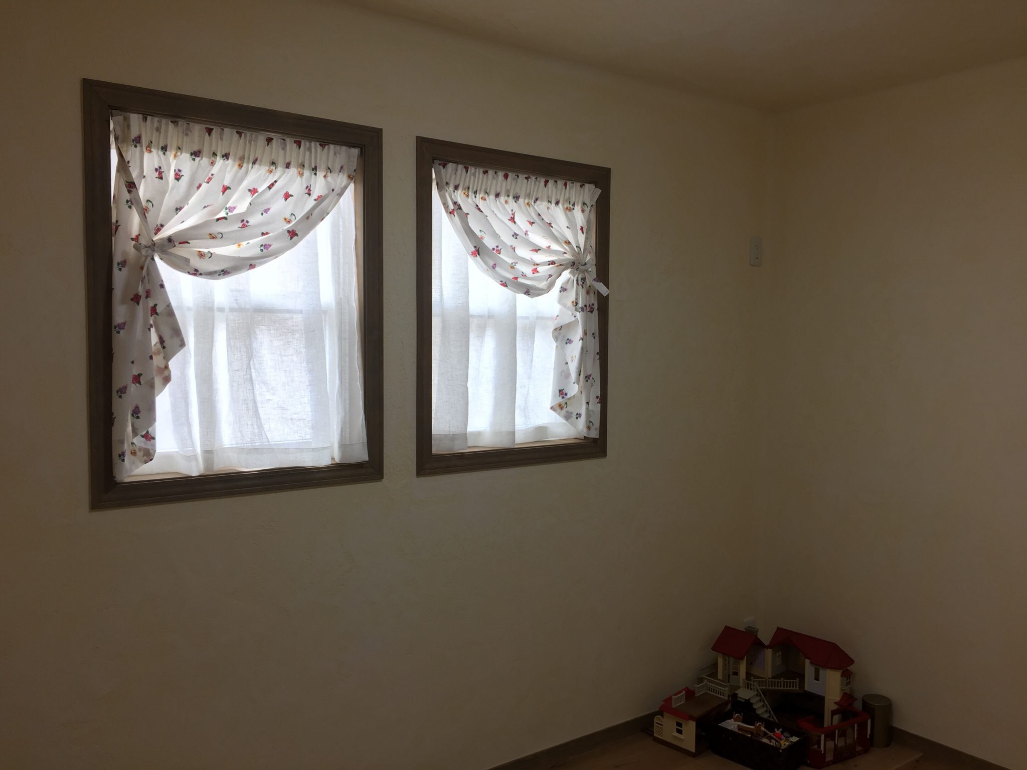 お客様からのご要望は「女の子のお部屋なので、可愛いくて明るい窓の形状にあったカーテンがいいなぁ」ということでした。 窓枠が輸入住宅によくあるケーシング枠だったので、この枠を隠さない窓枠内に取り付ける方法にしました。普通のカーテンにすると可愛いさが無いので、今回はギャザースタイルをご提案。