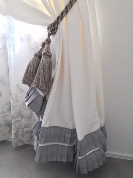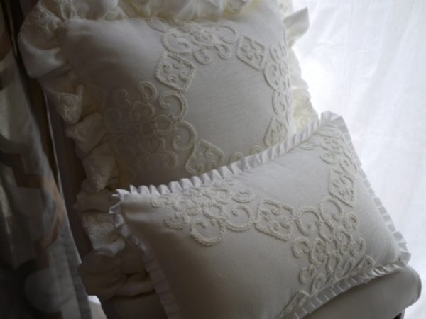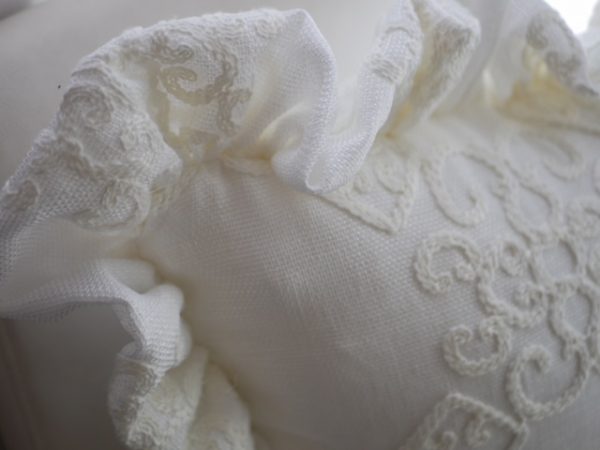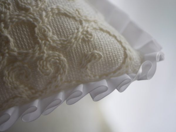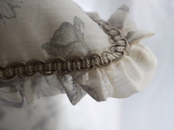 レースは透けるので別の色をベースに持ってきて雰囲気を変えましょうか?という案も出ましたがそのまま透け感を利用してフリルもWフリルにしそれでも何か欲しいということでブレードをクッションの淵にポーランド製のDEKOMAで仕入れたリサブレアオリジナルのブレードを当ててみるととてもしっくり馴染みました。