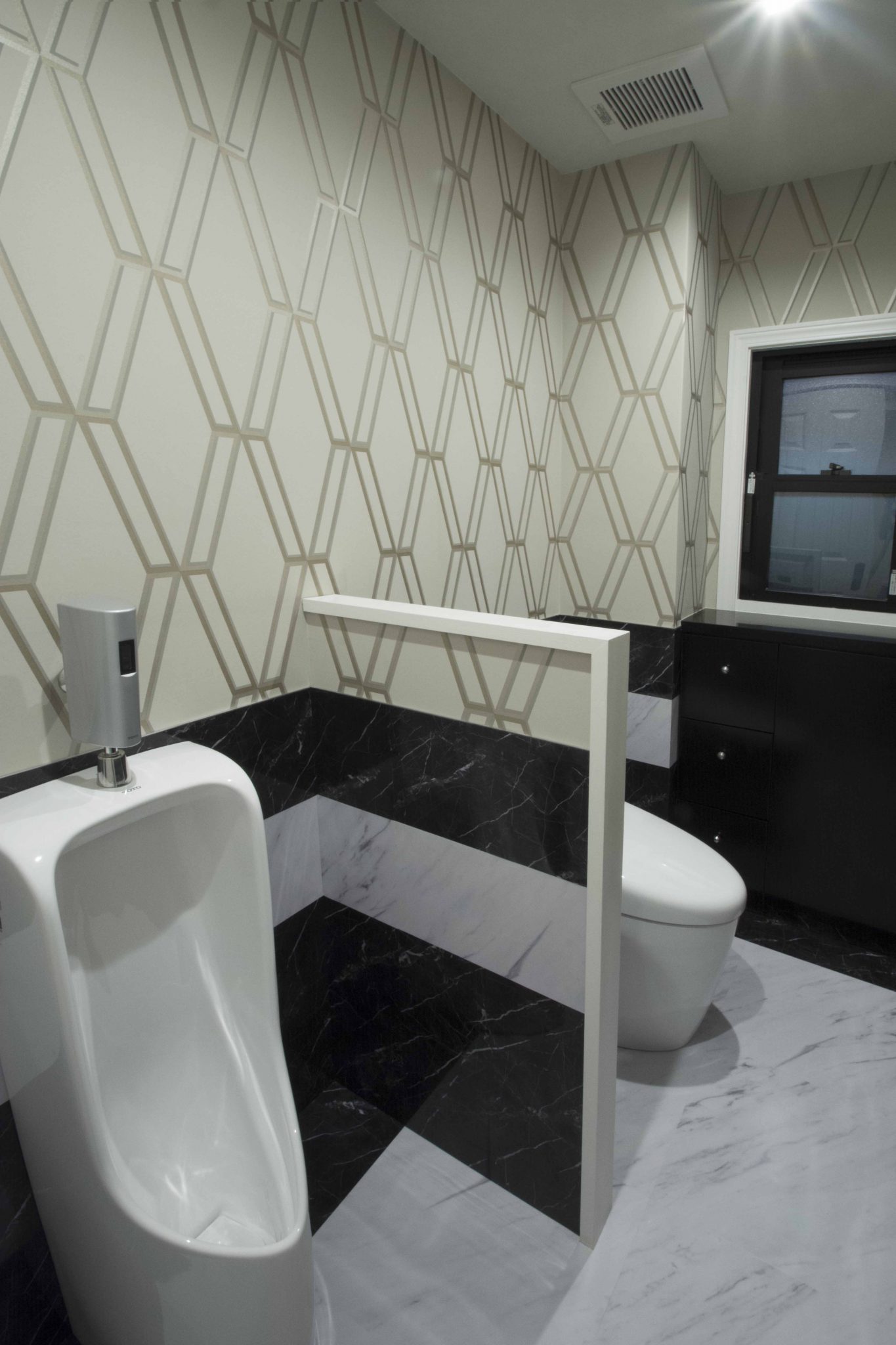 そして最後はトイレです。ここのお家のトイレは男性便器もあり広いのですが、すべて使うのではなく、途中で仕切って廊下側にはドアをつけずにちょっと素敵な手洗いがあれば、トイレの手洗いだけではなくお客様が手を洗うときにもプライベートな洗面ではなく使えます。